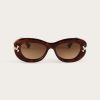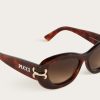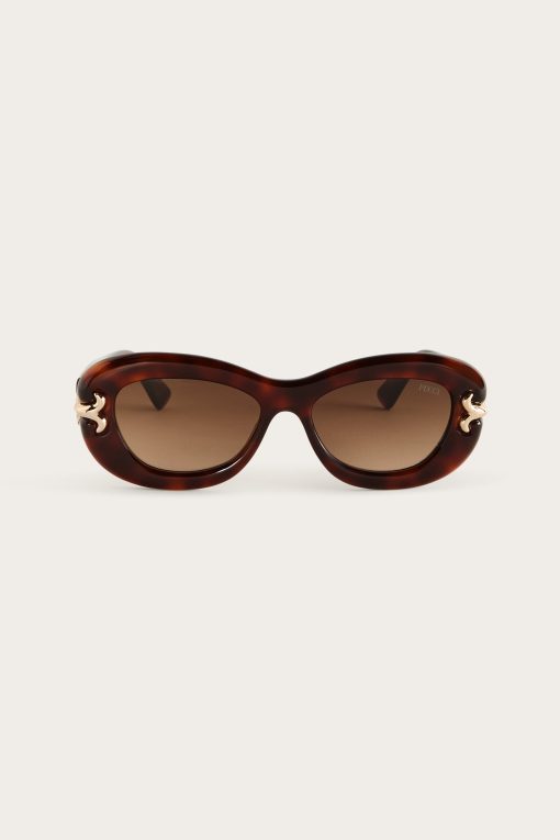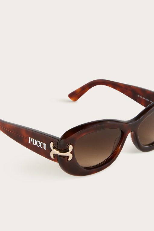 A contemporary icon that combines playful spirit and bold design. Pucci Fishtail glasses are distinguished by their oval, genderless silhouette, crafted in shiny acetate in a sought-after combination of warm shades. The frame, with a puffed structure, creates a bold graphic effect, while the temple tips reveal a refined detail: a small metal fishtail, a tribute to the name and distinctive sign of the model. The design is completed by temples embellished with the Pucci lettering logo, for an unmistakable stylistic signature. A bold accessory, born to shine under the sun.