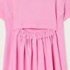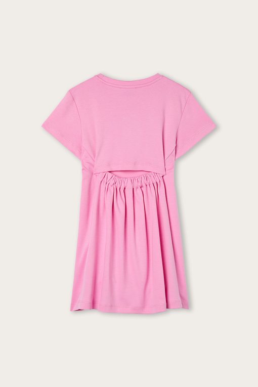 As comfortable as a T-shirt, as cheerful as an outdoor game. This dress is designed to accompany little ones’ days with lightness and color. The top is shaped like a classic short-sleeved T-shirt, while the flared skirt adds movement and freedom. The original elastic detail on the back, leaves a small opening that makes the garment even cooler and more suitable for the season. Completing the look is the colorful Pucci print on the chest: a lively and unmistakable touch, perfect for little women with a bold style.