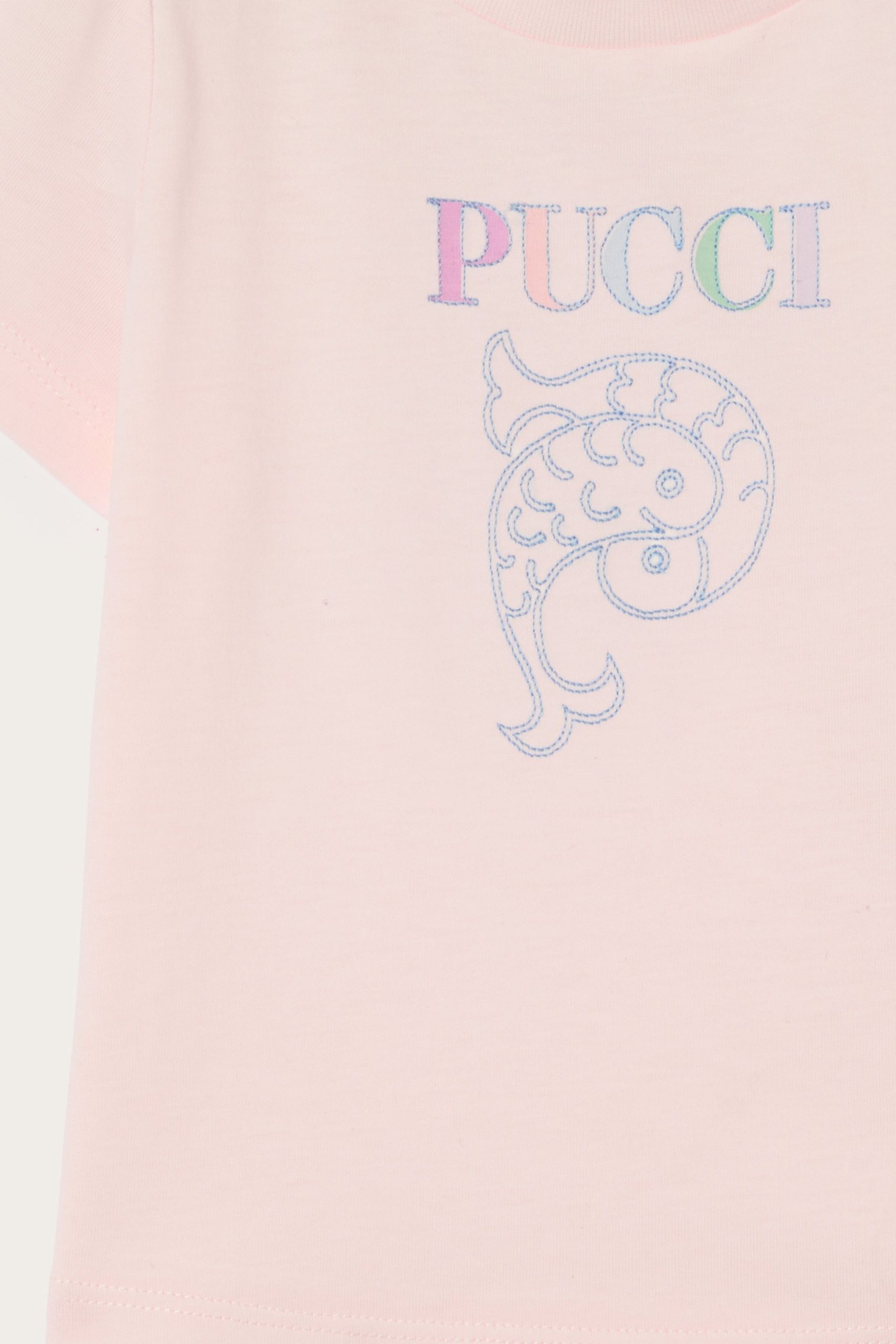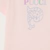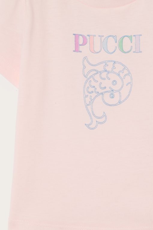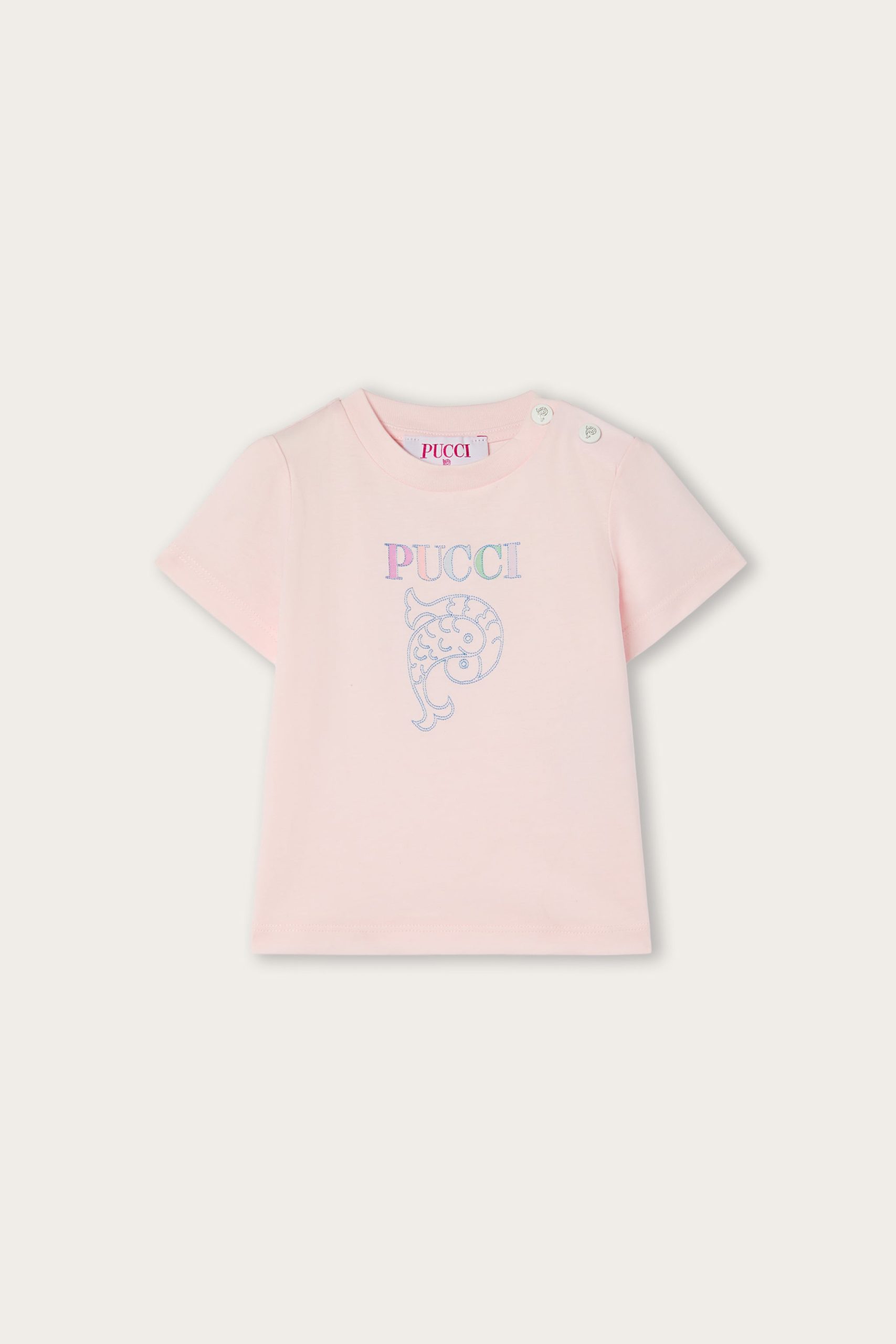 A basic item with irresistible details. This powder pink T-shirt in organic fabric is soft, breathable and designed for everyday comfort for little ones. Embroidery of the logo and iconic Pucci fish in the center brightens the front with a lively graphic touch.Buttons on the shoulder make it practical for even the littlest ones to wear.