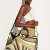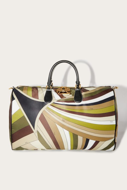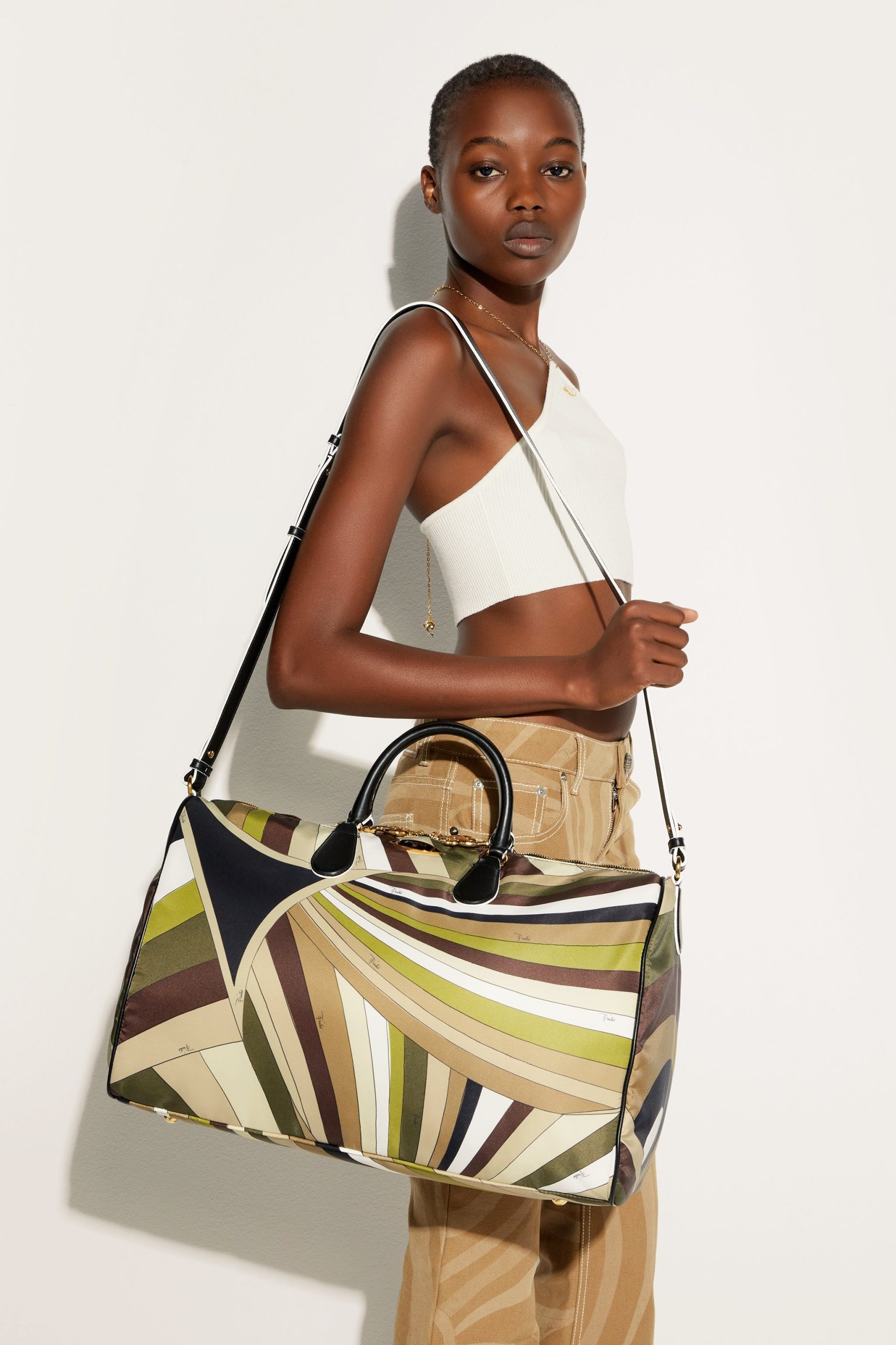 The large padded nylon bag is the perfect ally for those seeking practicality and style in a single accessory. Ideal for tackling the most hectic days with elegance, it combines lightness and sturdiness thanks to its printed nylon structure, enhanced by Nappa leather or Vacchetta leather trim, depending on the variant.The padded design and contrasting edges lend a modern and versatile character, while the iconic Iride print, declined in shades of khaki, celebrates Pucci’s timeless aesthetic. Distinctive details, such as the Pucci enameled plaque and Pesci-shaped zipper pull, add a touch of originality. Equipped with handles, an adjustable shoulder strap and an interior zippered pocket, it is perfect to accompany you on your daily adventures, from work to leisure.