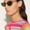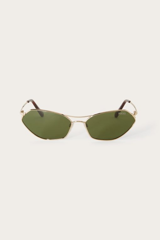 Fusing elements from pilot and cat-eye styles, these Pucci sunglasses are designed with a sculptural frame and a curved double bridge. They’re accented by signature fishtail details at the hinges that speak to the house’s nautical themes.