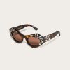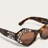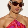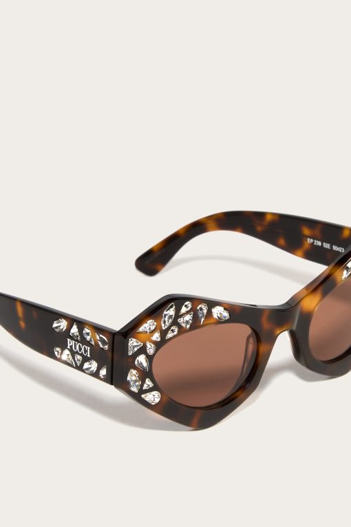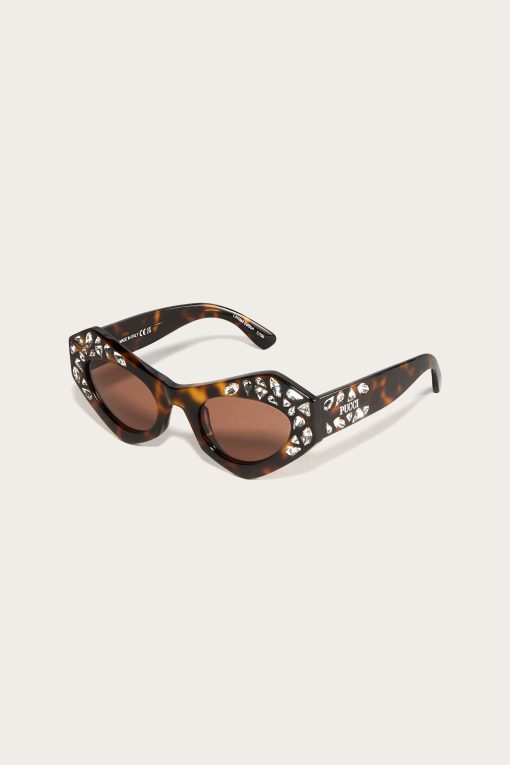 An accessory with a glam spirit, bold and irresistibly distinctive. These cat-eye sunglasses are characterized by a tortoiseshell acetate frame, embellished with a geometric decoration of applied rhinestones in relief, which enhances the angular shape and gives luminosity.The design is enhanced by thick temples with engraved logo, which reinforce the model’s bold character. Amber lenses add a vintage-chic touch, perfect for those who want a sophisticated and dramatic look with the unmistakable Pucci touch.