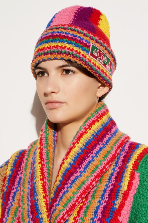 This beanie hat underscores Pucci’s joyful mood: it’s spun from wool with vibrant panels in rainbow hues. The logo patch at the turn-up brim is inspired by the Capri Sport label from the 50s.