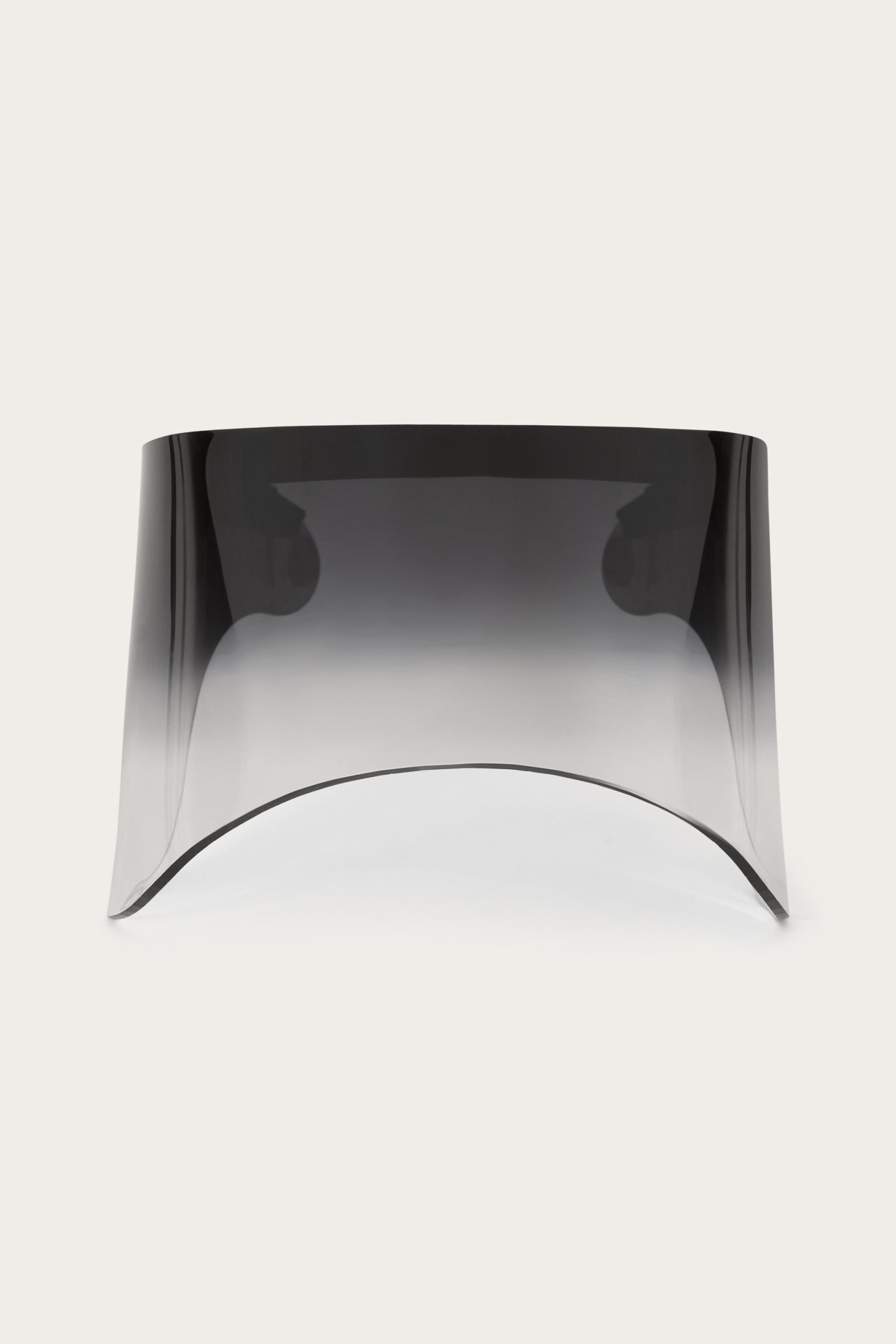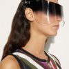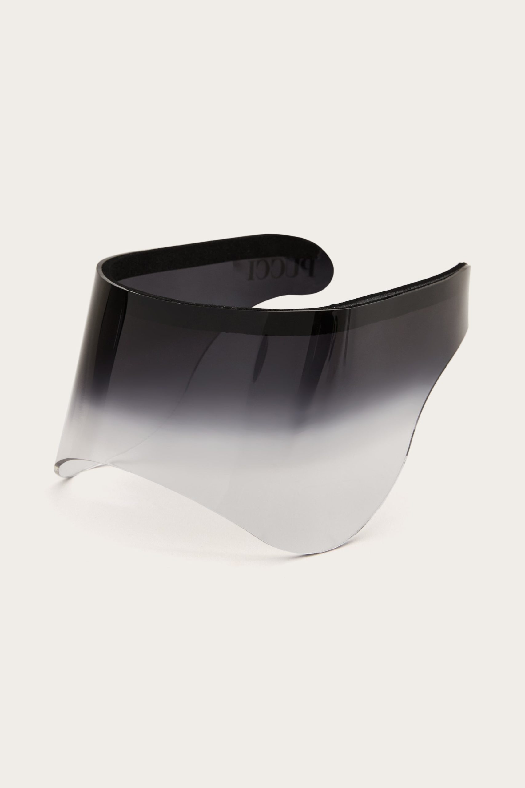Camille Miceli spotlights Pucci’s futuristic vision in this protective visor. The oversized design fades from black to transparent and is complete with the moniker and intertwined fish motif at the temples.