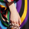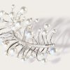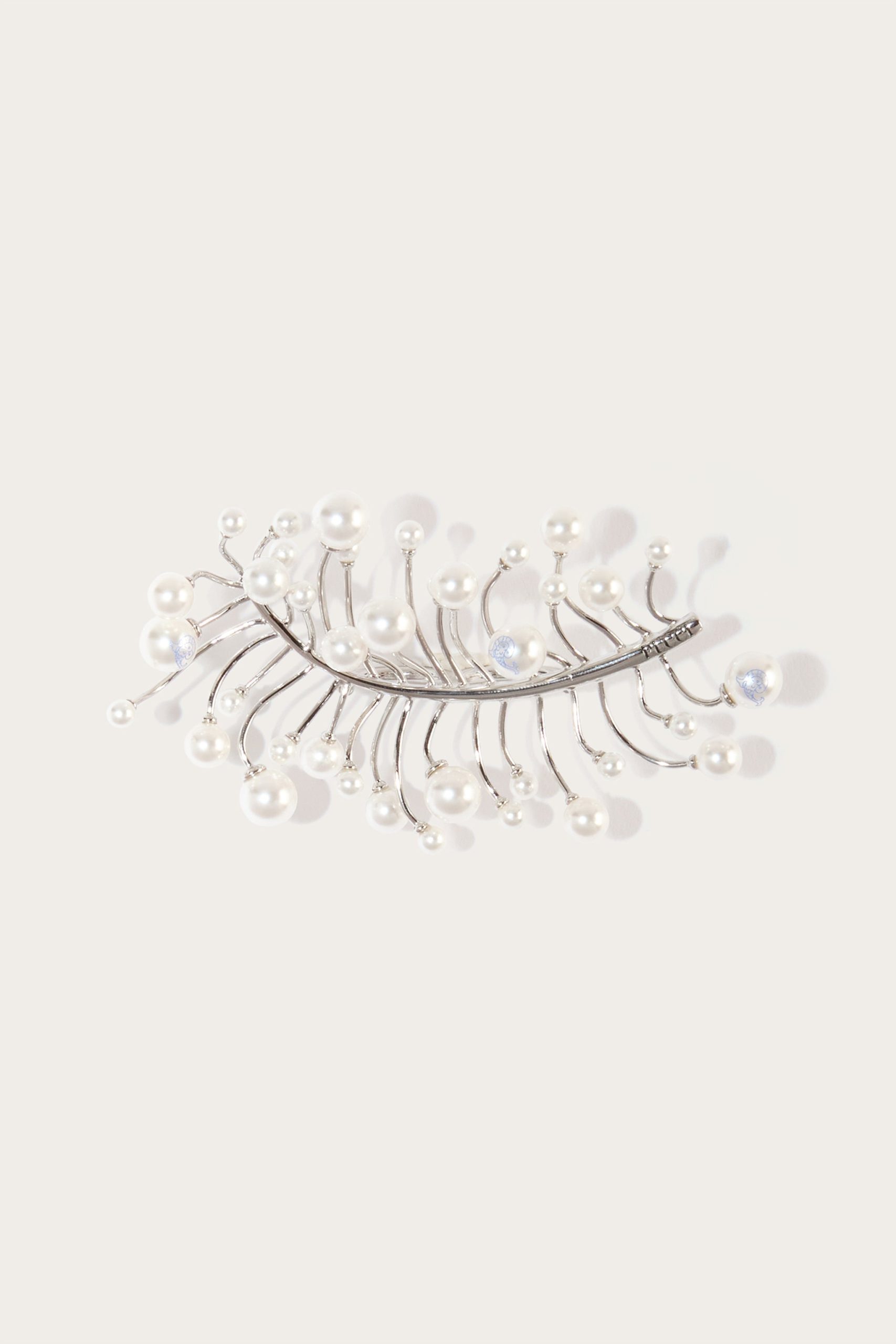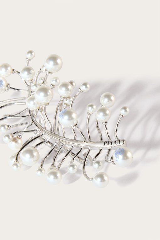 Designed to be worn across two fingers, this silver-tone ring fans into a feather shape with crystal-embellished arcs tipped with scores of faux pearls that look as though they’re floating.