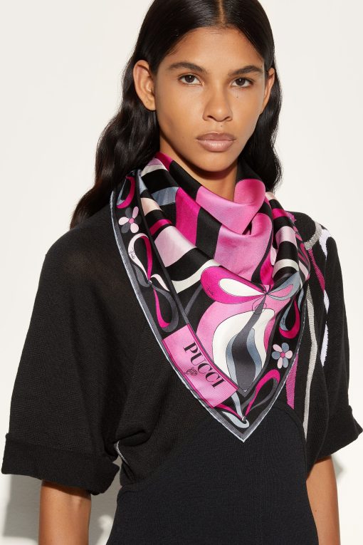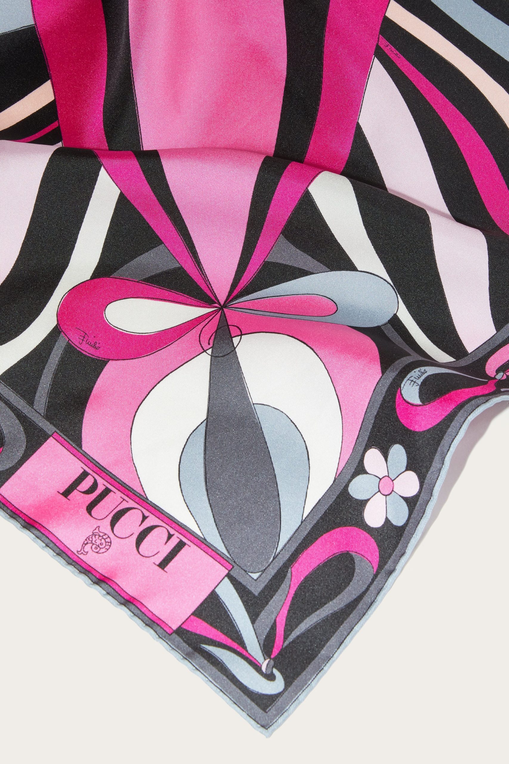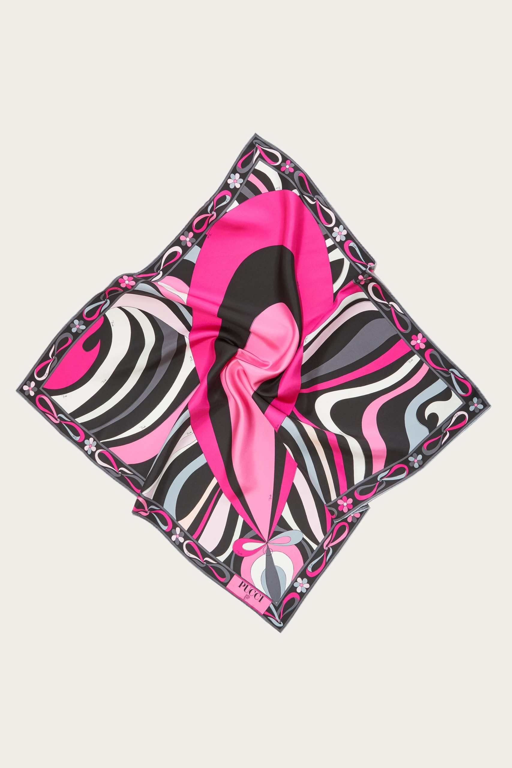 A timeless accessory that encapsulates all the essence of elegance and color of the Pucci world. This silk twill scarf, with its unique mix of prints in black and fuchsia tones, is the perfect detail to brighten any look.Versatile and sophisticated, it can be worn around the neck, tied in the hair or knotted to the bag for an unmistakable touch of class. A piece that speaks of style and personality, ideal for any occasion.