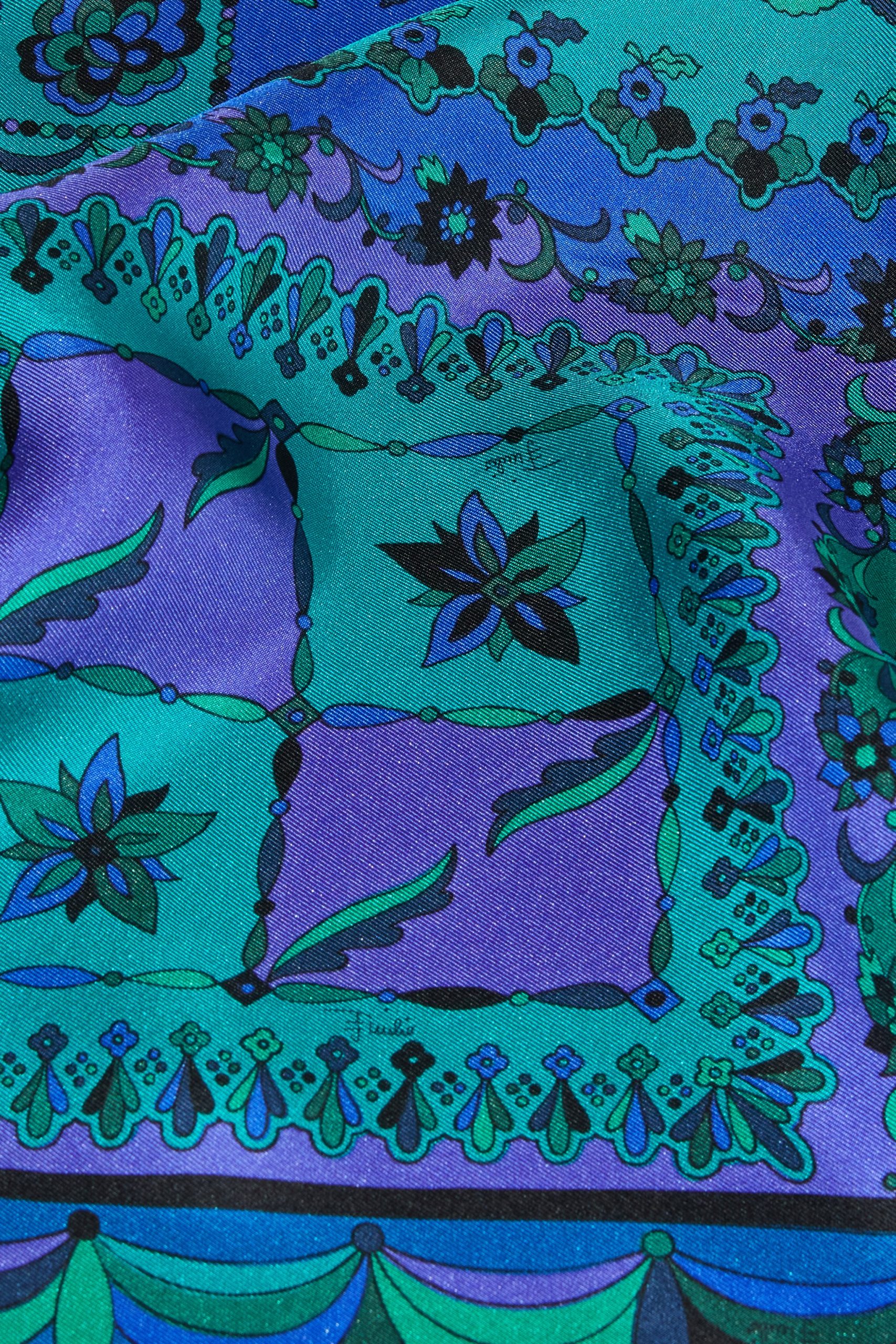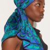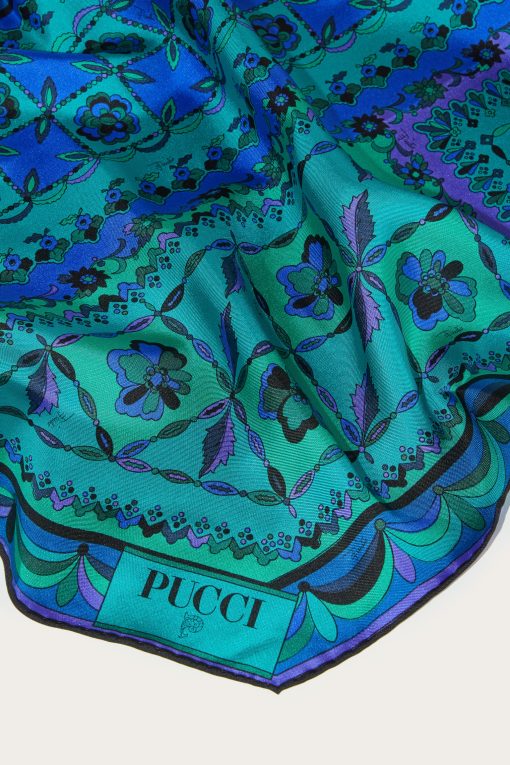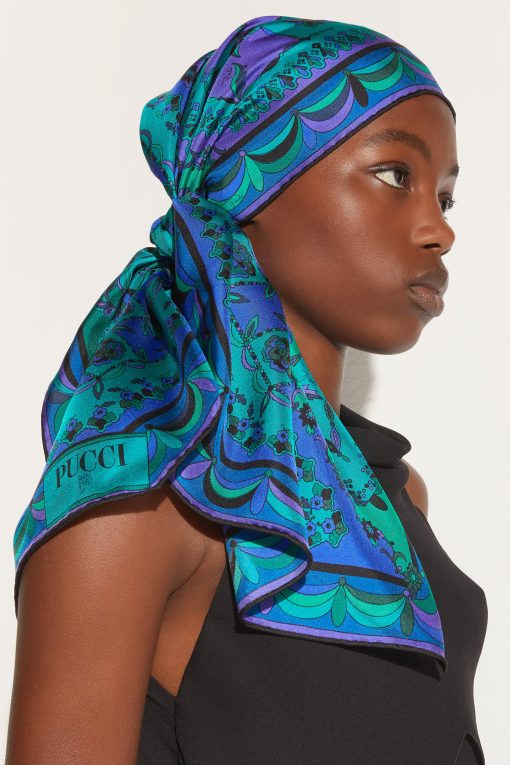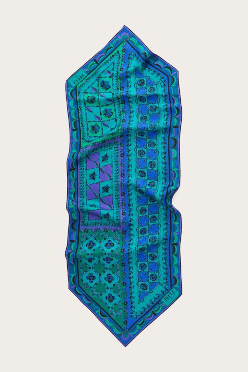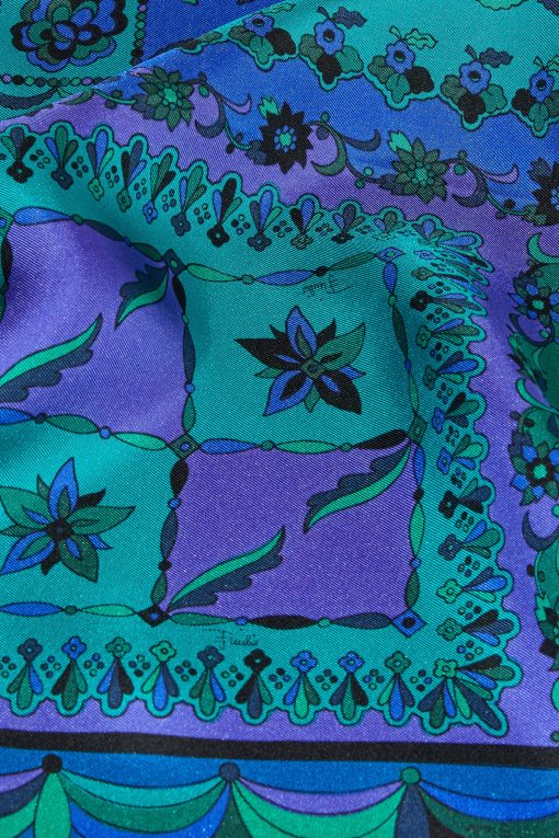 A sophisticated accessory that embodies Pucci’s elegance and chromatic energy. This silk twill scarf features Losanga and Festa prints in shades of emerald, creating a dynamic and refined effect. The printed edges add a distinctive detail, while the format makes it extremely versatile: perfect to tie around the neck, hair or bag for a touch of unmistakable style.