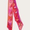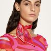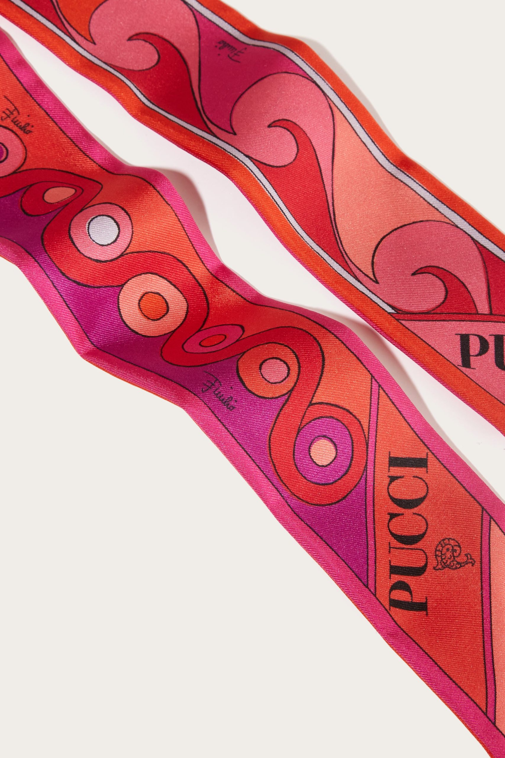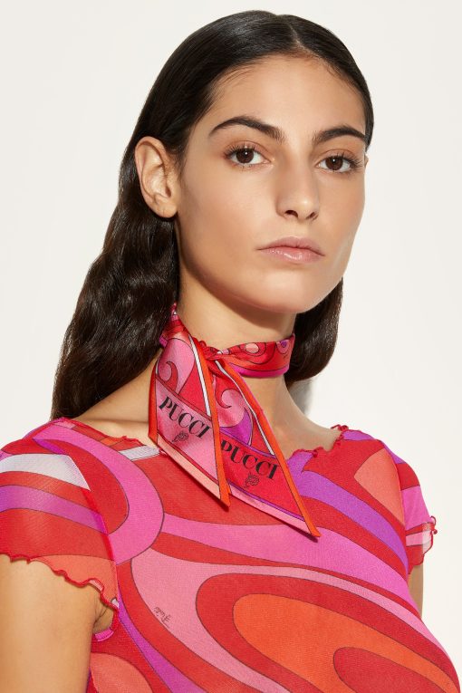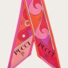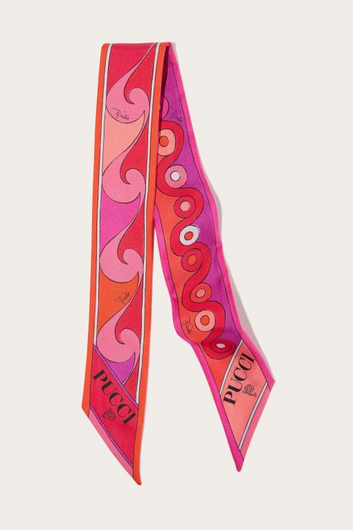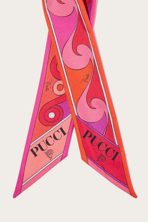 An elegant and versatile accessory, perfect for adding a touch of color to any look. This silk twill bandeau features pointed edges and a refined play of Iride and Bouclè prints, in vibrant shades of coral and fuchsia. Light and sophisticated, it can be worn in different ways: as a headband, around the wrist or tied to a bag for a distinctive detail that expresses the unmistakable Pucci style.