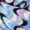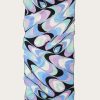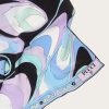 This silk stole showcases the Onde print in elegant blue and purple hues, with contrasting borders that add visual intrigue. A signature detail at the corner features the house moniker alongside Pucci’s iconic intertwined fish motif. It’s designed to be used as a head covering.