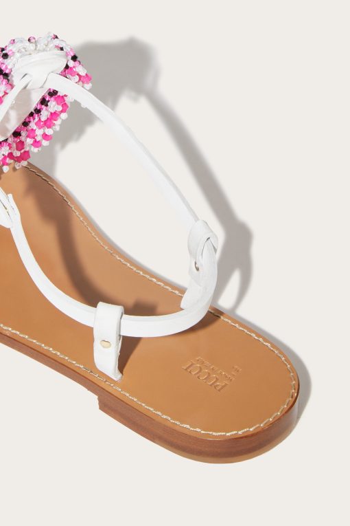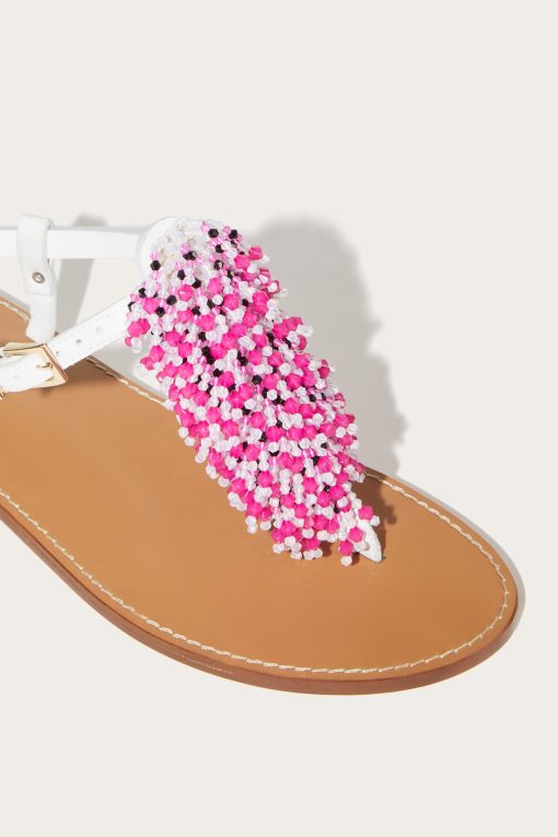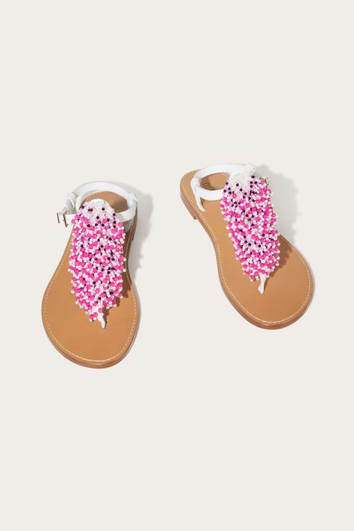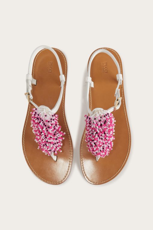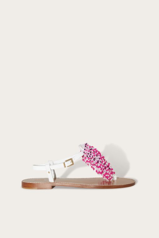Perfect for a promenade or an outdoor brunch, the beaded waterfall flat sandals are the ideal mix of laid-back elegance and statement details. Their refined silhouette, combined with the practicality of an adjustable strap, makes them a must-have for the summer season. Lightweight and versatile, they are the perfect complement to lightweight dresses and casual-chic looks.The nubuck leather upper decorated with metal rivets and cascading beaded embroidery on the front add a touch of glamour, while the leather sole ensures comfort and durability.
