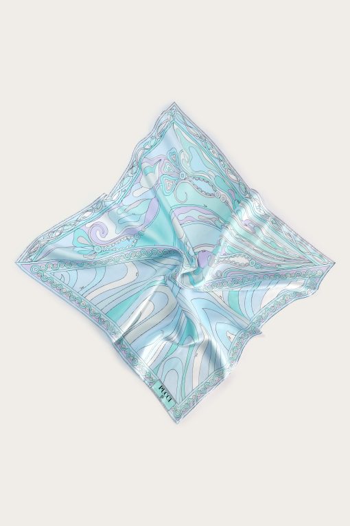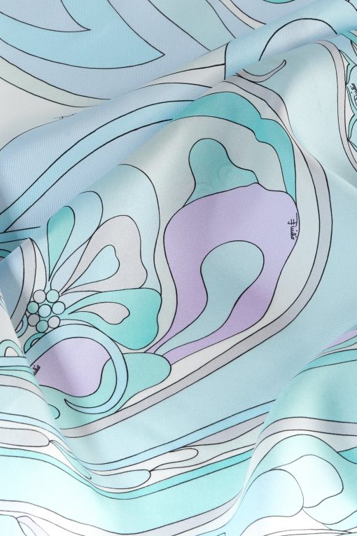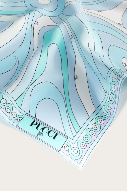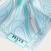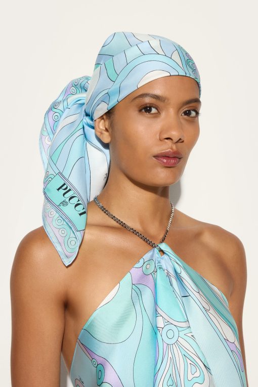 An exclusive selection of Pucci’s iconic garments in an unprecedented version of the Marmo and Orchidee prints in the most delicate shades of aqua. A combination of craftsmanship, color and identity. An elegant and versatile accessory perfect for adding a splash of color to any look. This lightweight and sophisticated silk twill carre can be worn in a variety of ways: as a headband, around the wrist or tied to the bag for a distinctive detail that expresses Pucci’s unmistakable style.