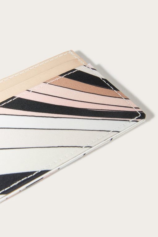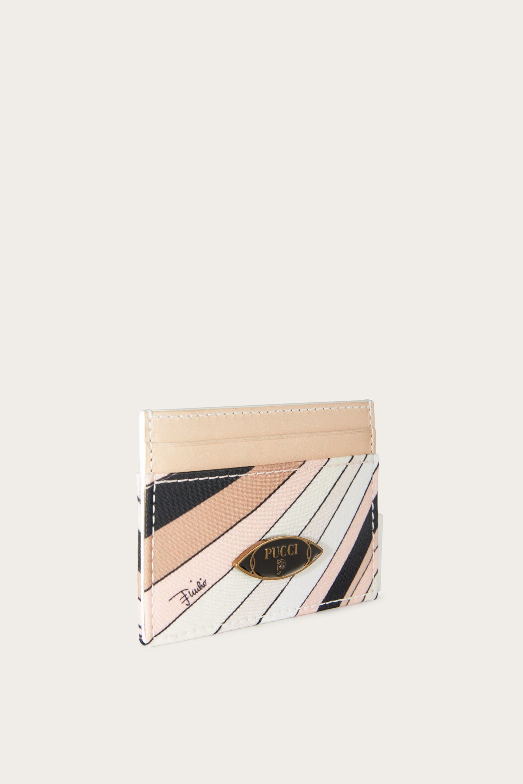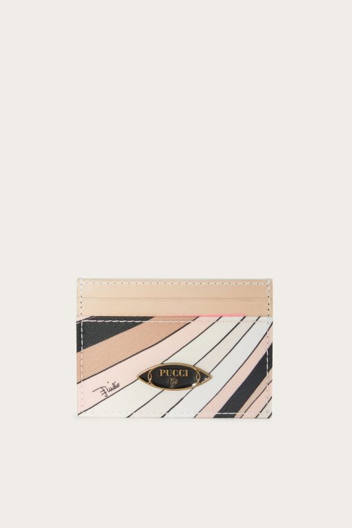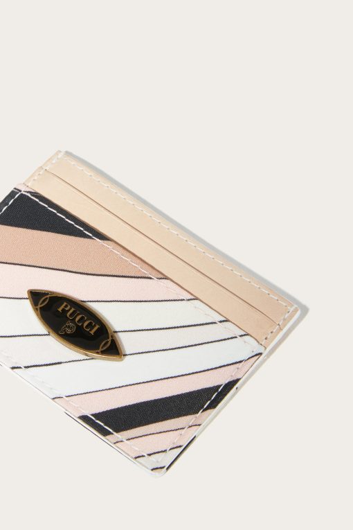 A compact, refined accessory perfect for storing your cards in style. This printed nylon card case is embellished with nappa leather trim and a Pucci enamel plaque, which adds a distinctive touch.Contrasting edges enhance the sophisticated design, while the nude-colored Iride print gives a timelessly elegant graphic effect. A small essential with a strong character, ideal for those who love thoughtful and functional details.