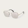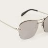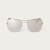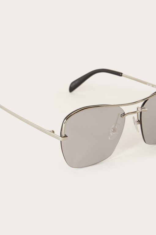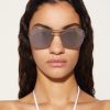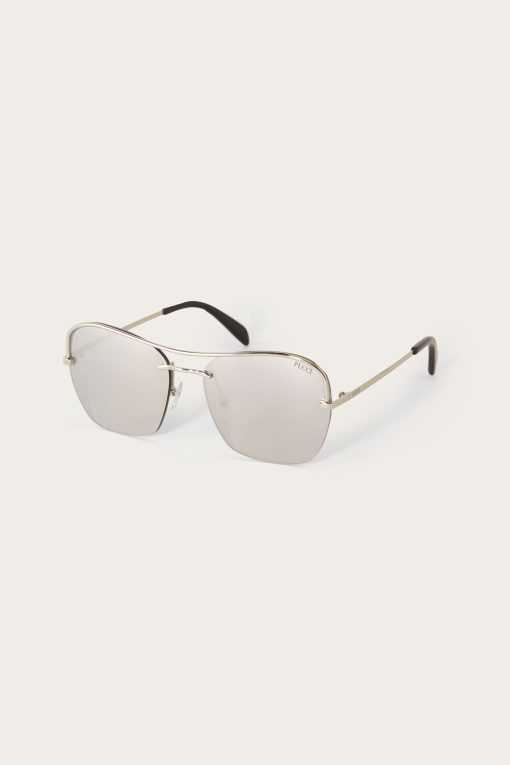 Showcasing a curved metal brow bar and rimless square lenses, these mirror sunglasses highlight Pucci’s directional approach to design. Note the logo at the temple.