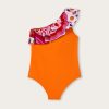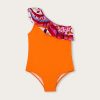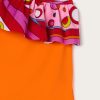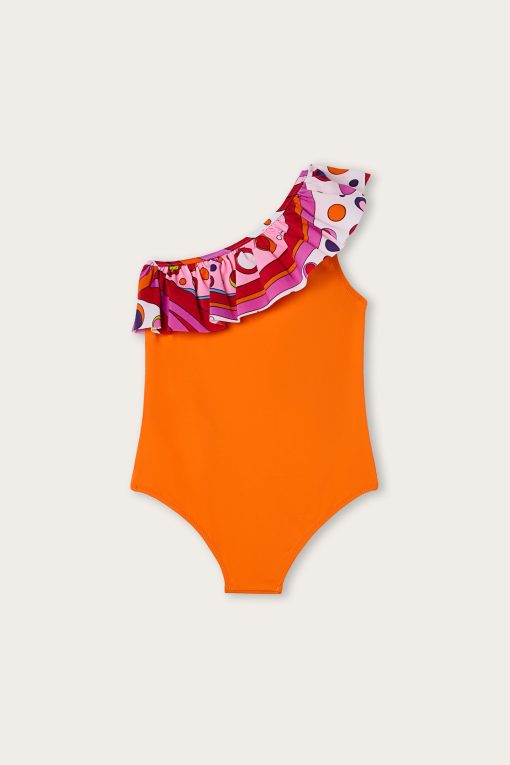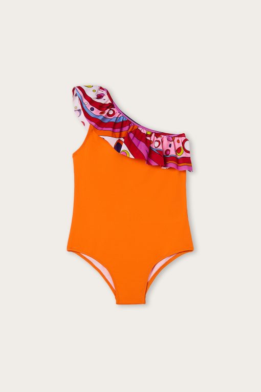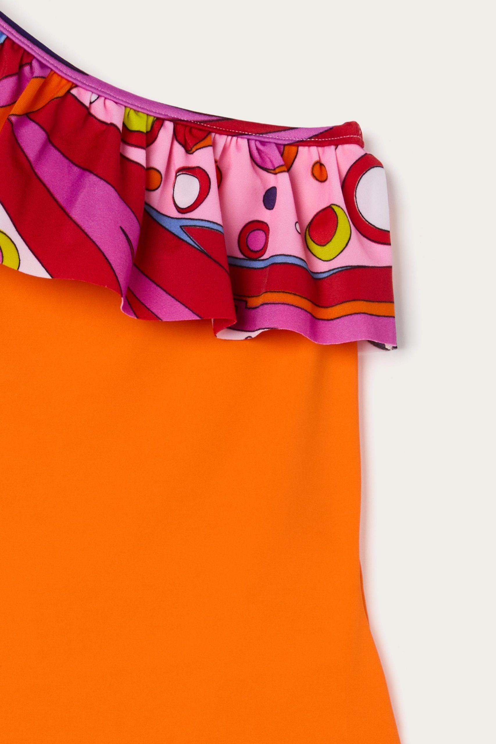 A cheerful and refined beach look: this solid-colored lycra one-piece swimsuit stands out for its asymmetrical neckline, enhanced by a contrasting printed fabric ruffle that adds movement and a typically Pucci playful touch.Made of stretch fabric, it is comfortable to wear and perfect to accompany days at the beach or pool with style and freedom.