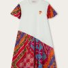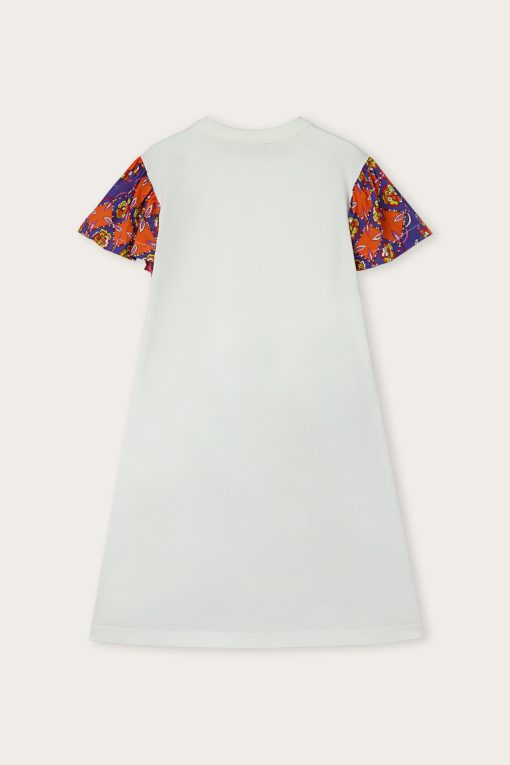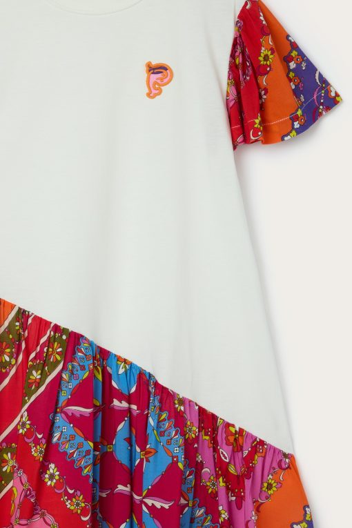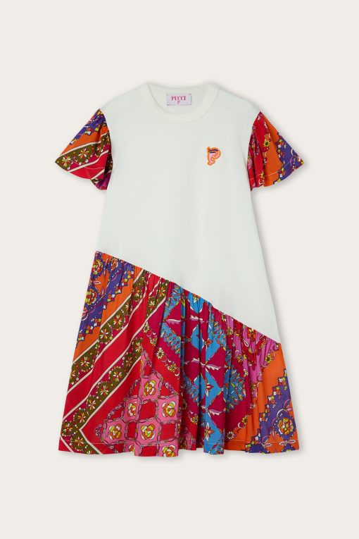 A dress designed to play with color and style. This short-sleeved T-shirt dress is made of soft, breathable cotton, and is embellished with an embossed patch of the iconic Pucci fish on the chest-a fun, recognizable detail that adds personality to the look.The contrasting sleeves and skirt, made of viscose with a vibrant Pucci print, turn the garment into a little bundle of energy and cheer, perfect for any self-respecting little style explorer.
