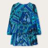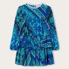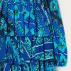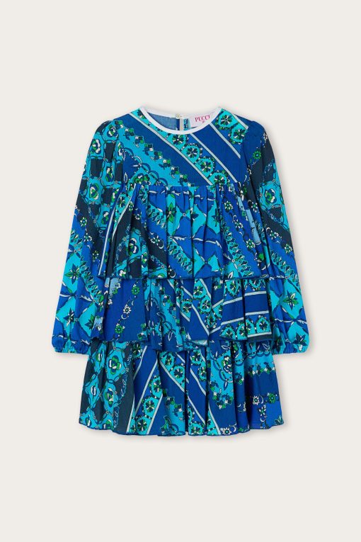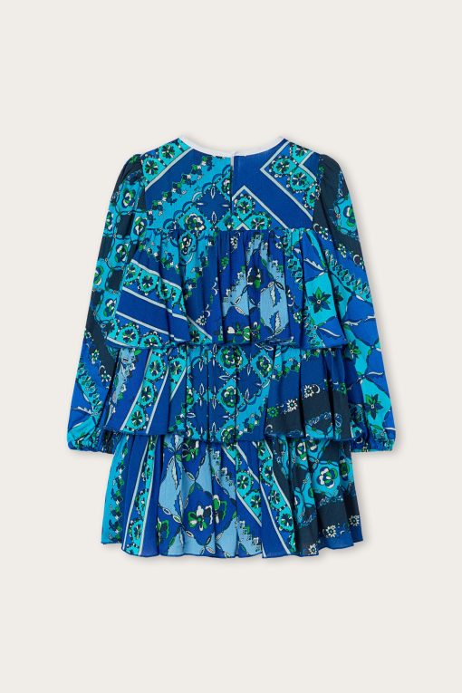 A dress that invites you to move, dance and have fun. This long-sleeved style is made entirely of ruffles, creating a light effect full of movement with every step.The button closure at the back of the neck makes the garment easy to wear, while the blue-tone Festa print makes it unique, vibrant and perfect for any special occasion (or to turn every day into a party).