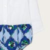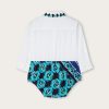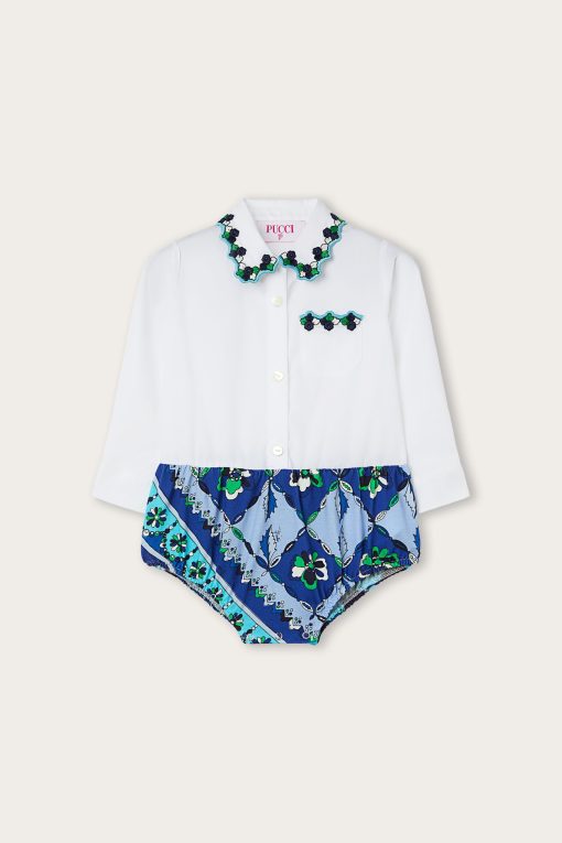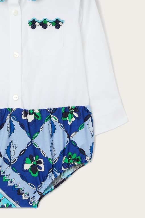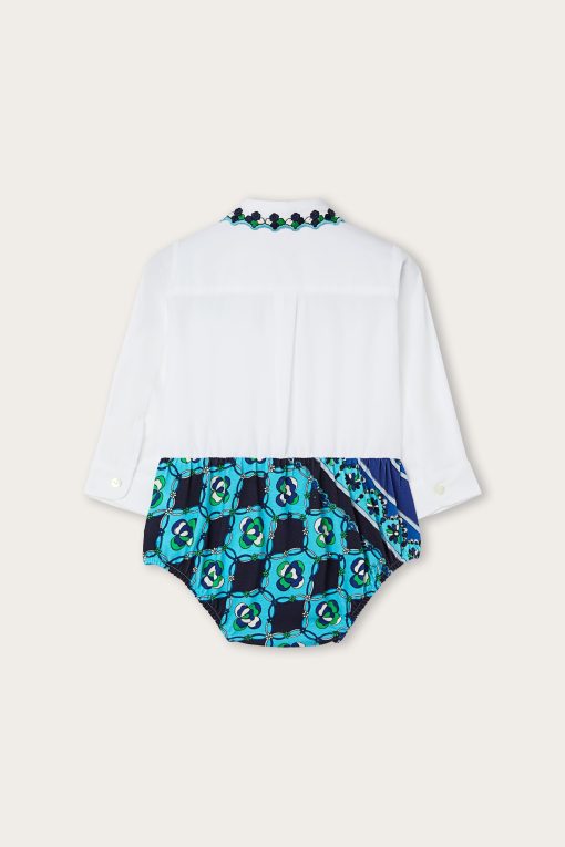 Elegance and sweetness meet in this combo baby romper, designed to combine style and practicality from the earliest days. The upper part recalls a white long-sleeved shirt, while the softer, shorter lower part is made of stretch jersey decorated with the vibrant Fontane print.A unique and functional garment, perfect for first outings or as a refined gift idea.