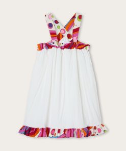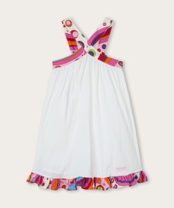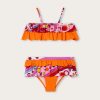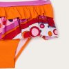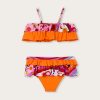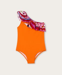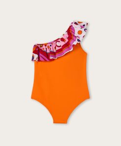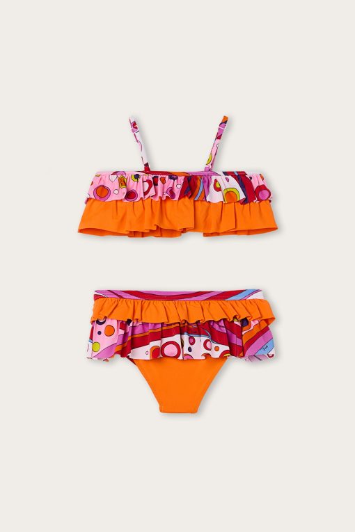 Colorful, comfortable and full of movement. This stretch jersey bikini is perfect for little summer lovers. Decorated with the vibrant Fontane print in orange and multicolor, it is enriched with light ruffles that give a fluttery and fun effect, ideal for days at the beach or pool.A mix of comfort and style signed Pucci, designed to accompany every dive with joy.