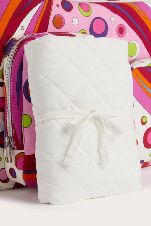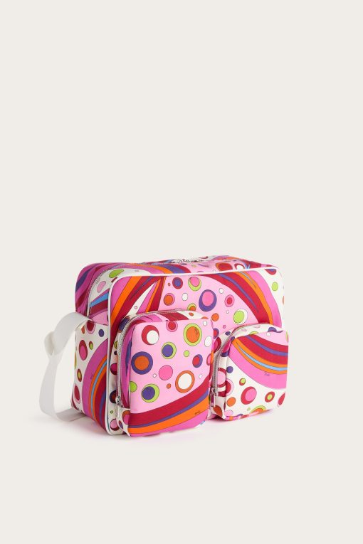 Practical, capacious and definitely stylish. This diaper bag is designed to accompany every move with functionality and a touch of Pucci signature color. Decorated with the Fontane print in shades of orange and multicolor, it combines vibrancy and organization in one essential parenting accessory.With 40 cm handles and a spacious interior, it is perfect as a diaper holder or for carrying all your baby’s necessities with vibrant elegance.
