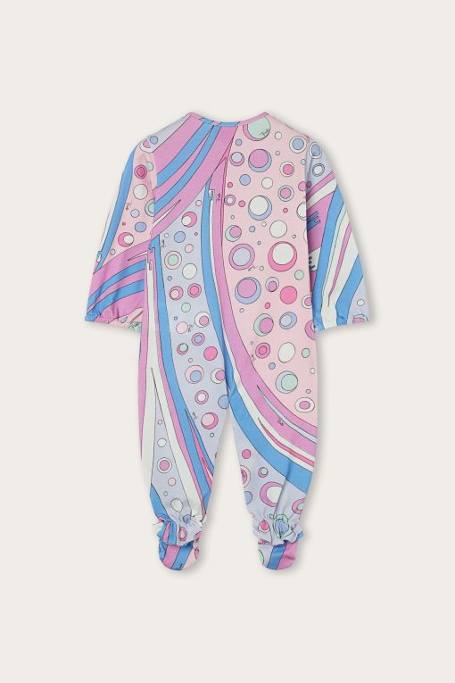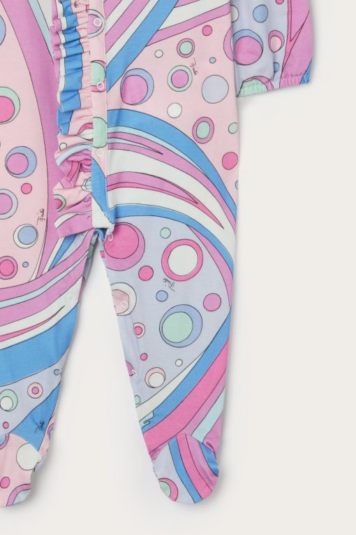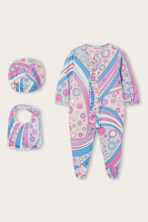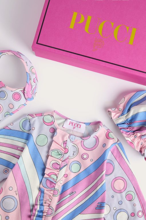A very sweet set designed to welcome babies in style: this maternity set includes a romper, cap and bib, all made of stretch jersey that is soft and gentle on babies’ skin.The Fontane print in pink and multicolor embellishes all the accessories with the unmistakable Pucci touch, for a first outfit that is tender, comfortable and full of personality.
