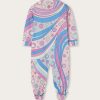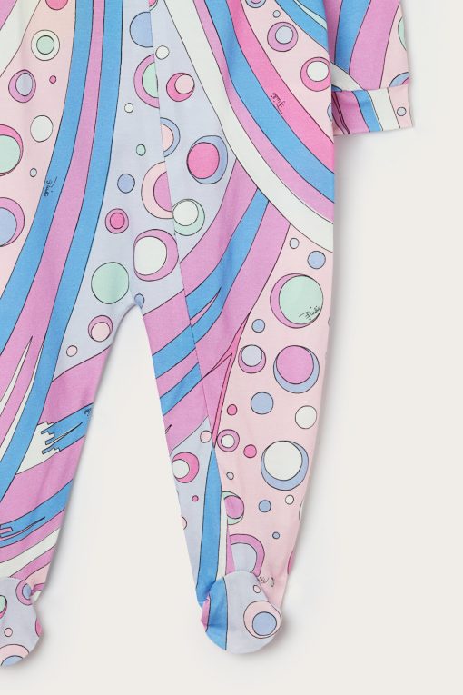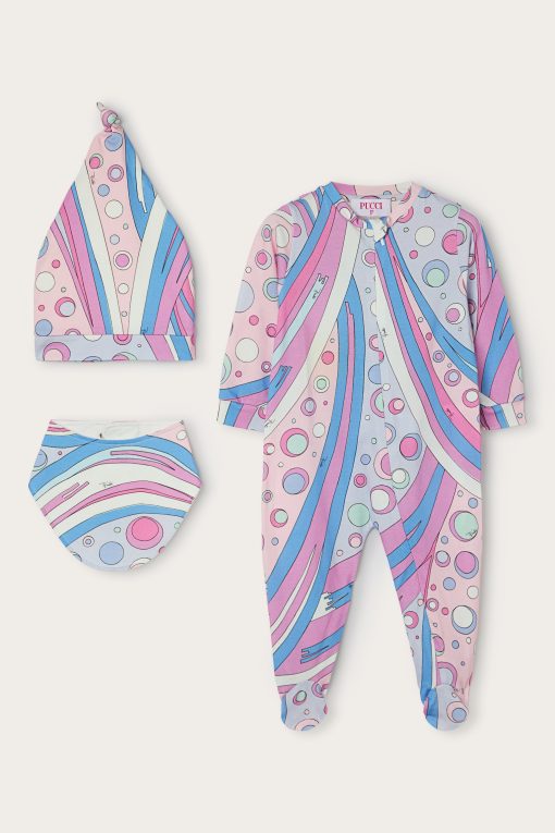 A very sweet set designed to welcome babies in style: this maternity set includes a romper, cap and bib, all made of stretch jersey that is soft and gentle on babies’ skin.The Fontane print in pink and multicolor embellishes all the accessories with the unmistakable Pucci touch, for a first outfit that is tender, comfortable and full of personality.