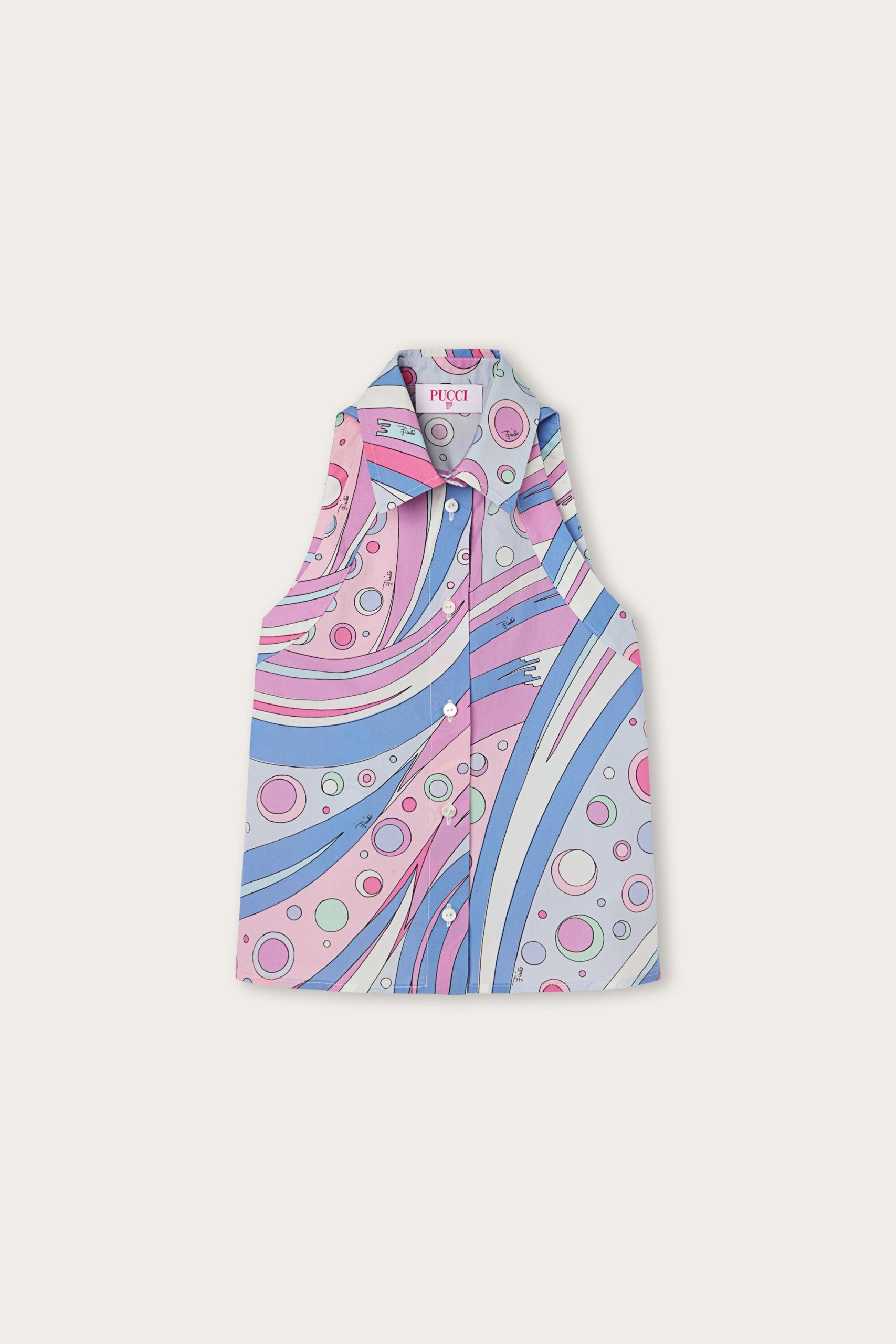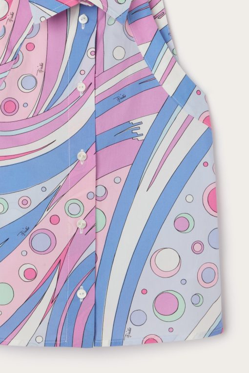 Lightweight, cool and full of color. This sleeveless shirt is perfect for sunny days, thanks to its simple design with front buttons and 100% cotton fabric that ensures comfort and breathability.The Fontane print in shades of pink and multicolor adds vibrancy and an artistic touch, for a cheerful and unmistakable style, signed Pucci.