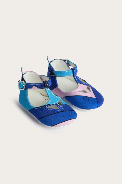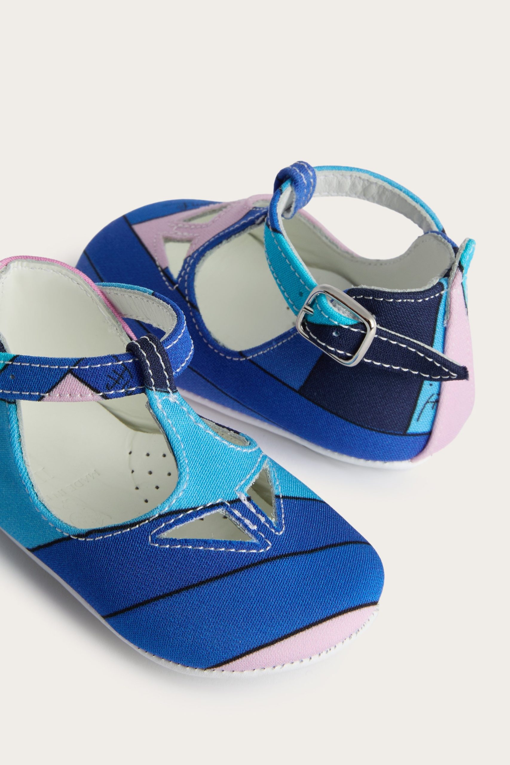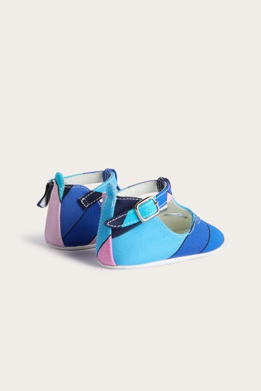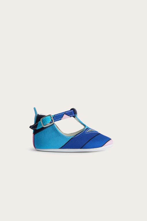Unmistakable style from the very first steps…These ballerina model shoes are designed to give comfort and sweetness to the smallest feet, with a tender and refined design. The stretch cady fabric wraps delicately, while the Iride print in light blue and multicolor adds a lively and colorful note, typical of the Pucci world.Leather details make the model even more precious, perfect for special occasions or as an unforgettable gift.