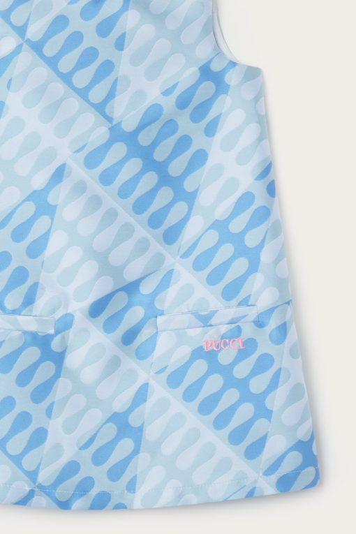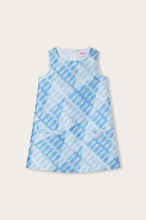 A sophisticated look in a mini version. This sheath model dress is made of jacquard fabric fully printed with Leocorno pattern in delicate ivory and light blue tones. A perfect combination of elegance and color, designed for special occasions…or to feel special every day!The embroidered embossed Pucci logo adds a precious touch, while the two front pockets make it practical and irresistibly adorable.
