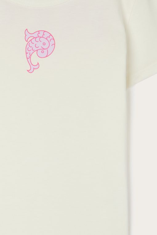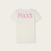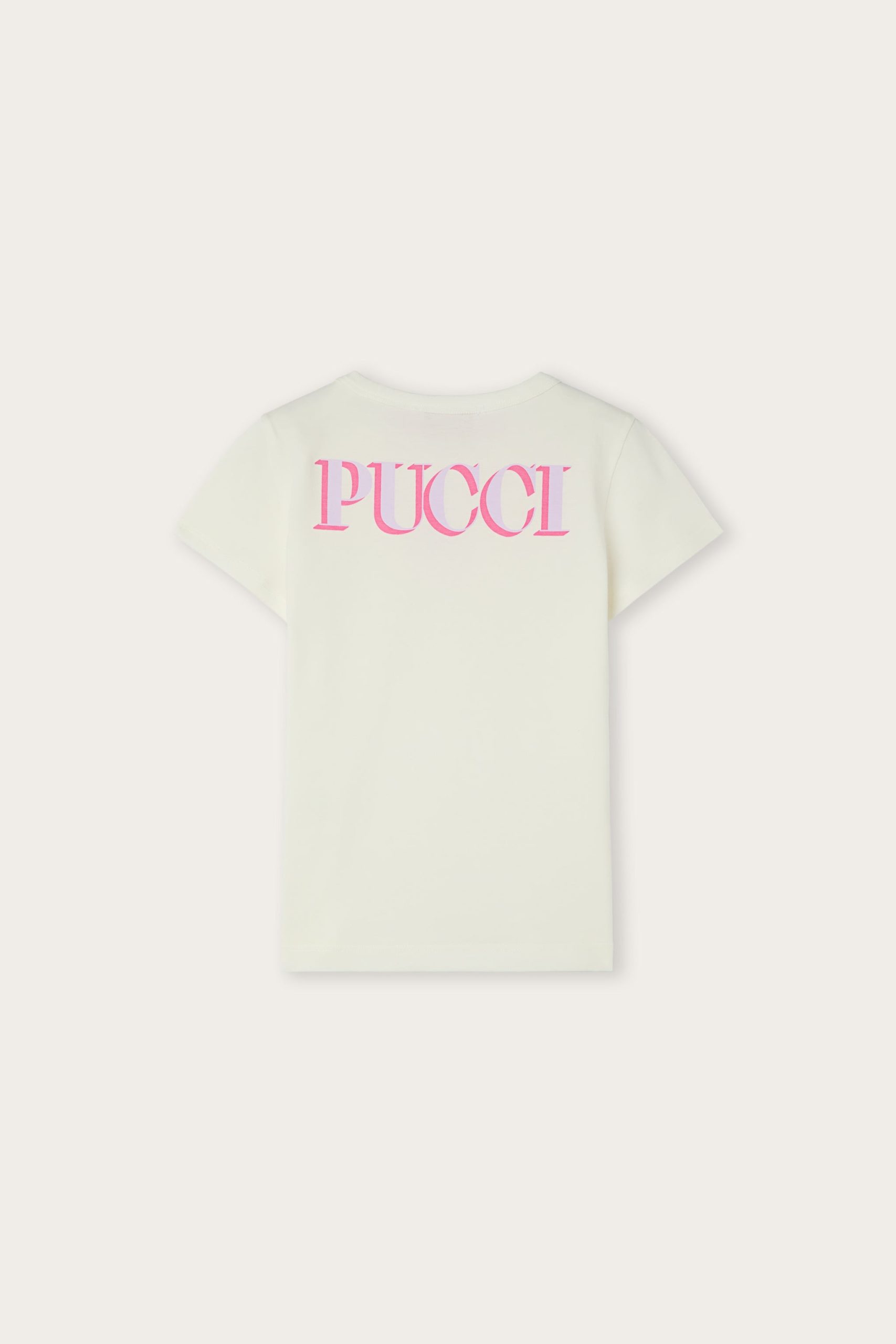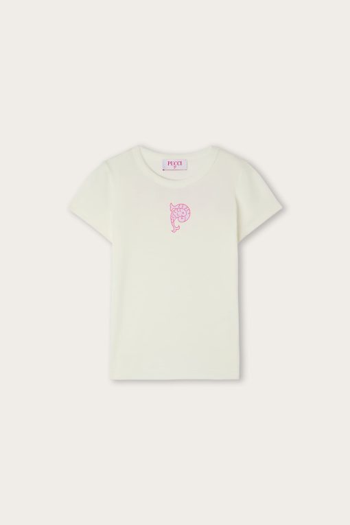 Simple but with a fun twist, this short-sleeved T-shirt with a comfy fit is perfect to accompany every day with style and comfort.On the front stands out the fish print, the iconic and playful symbol of the brand, while on the back the Pucci logo completes the design with a discreet but recognizable graphic touch. All in a soft ivory base in 100% cotton.