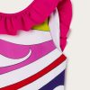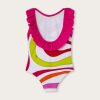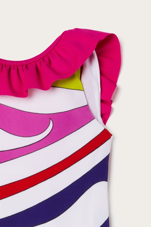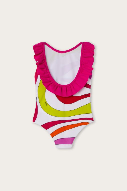 Perfect for little ones who love color and movement, this stretch jersey one-piece swimsuit is decorated with the iconic Marmo print in shades of ivory and orange for a cheerful, sunny look.Romantic ruffles on the neckline and back add a playful touch, making it even more special for beach or pool days.