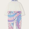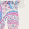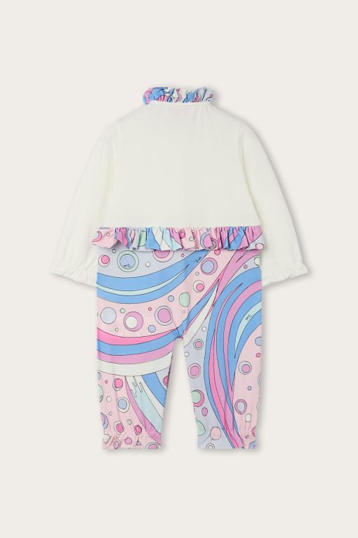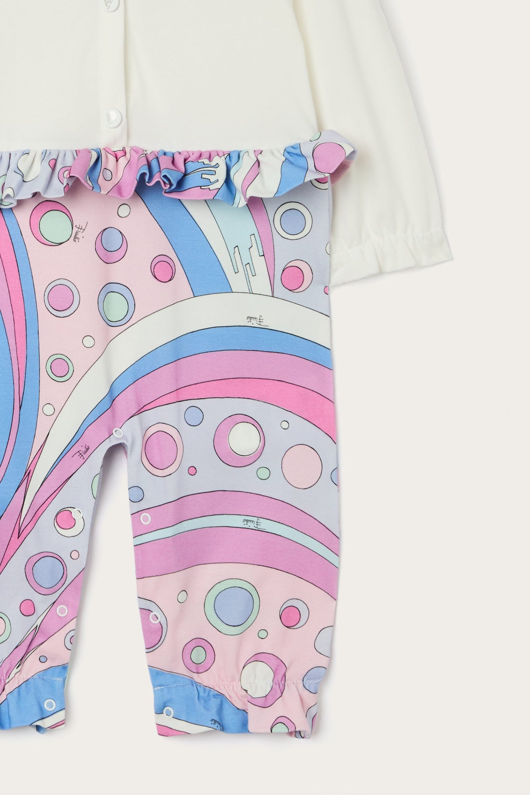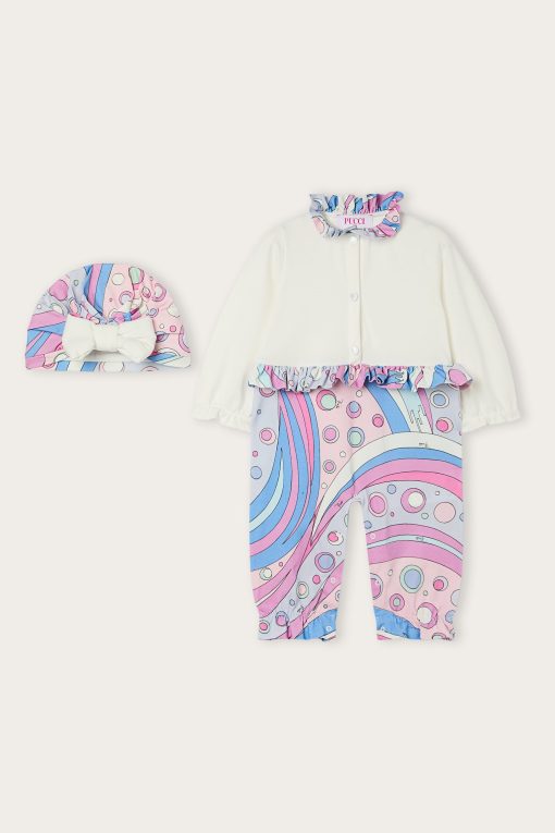 A very sweet matching set perfect for those first cuddles. This maternity set consists of an ivory stretch jersey romper and a matching hat with bow, both embellished with printed details that bring a touch of color and Pucci’s unmistakable style even in the first days of life.Soft, comfortable and easy to wear, it is the ideal gift to welcome little ones with elegance and tenderness.