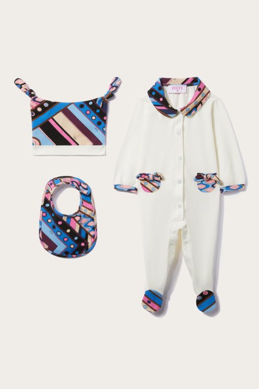 Embodying Pucci’s playful vision, this babygrow set boasts small fragments of the Vivara print, which infuses it with cheerful bursts of colour. It’s crafted from soft stretch cotton and comprises a hat, bib and matching onesie.
