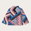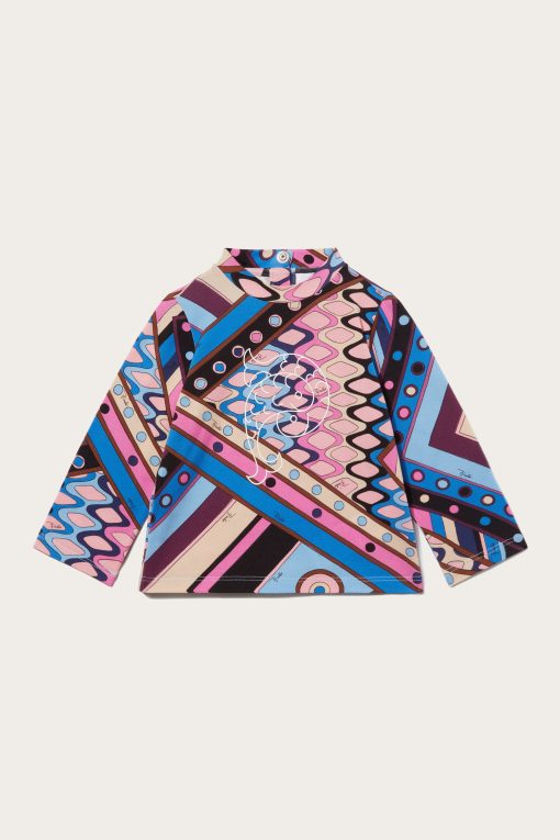 This top offers a fresh interpretation of Pucci’s Mediterranean legacy by combining signature motifs. The Vivara print imbues it with bold hues, while the intertwined fish logo adorns the front.