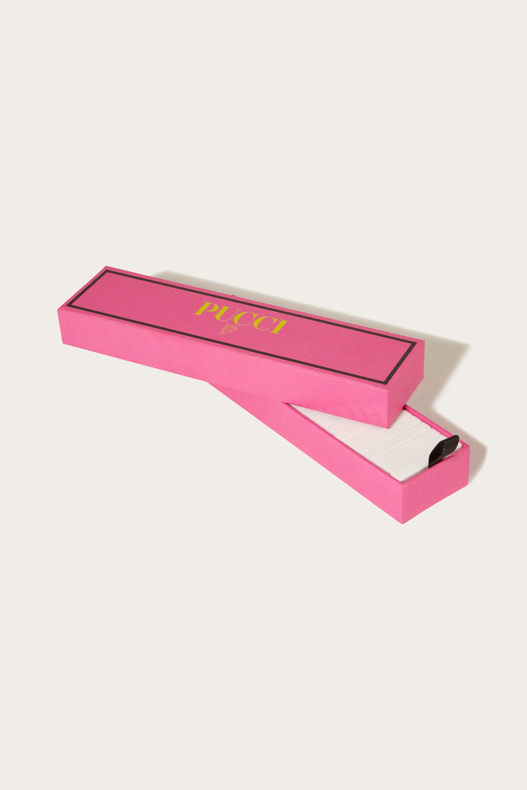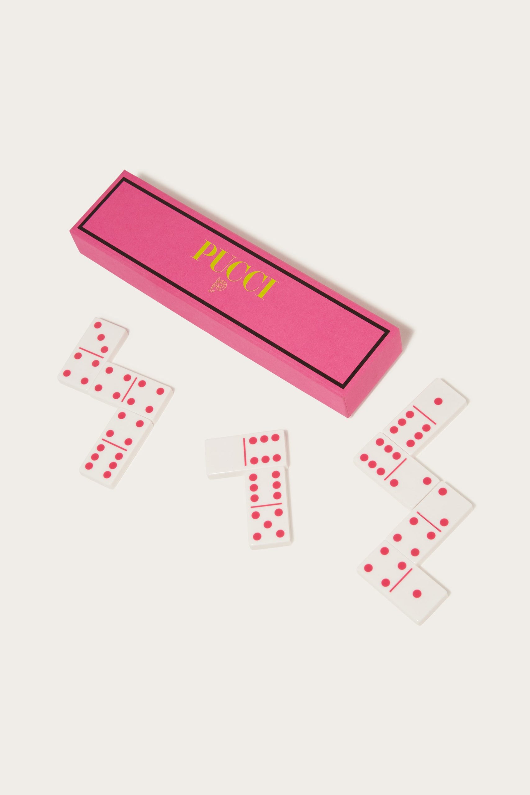 Pucci’s dominoes set spotlights the intertwined fish motif introduced by Camille Miceli. Bright fuchsia iterations of the logo punctuate a glossy white backdrop.