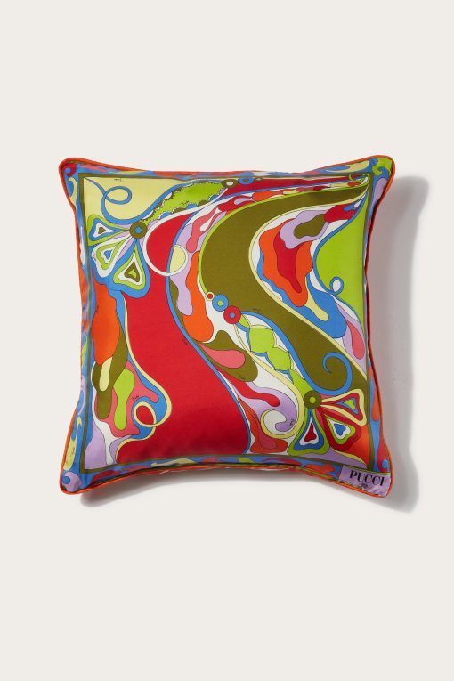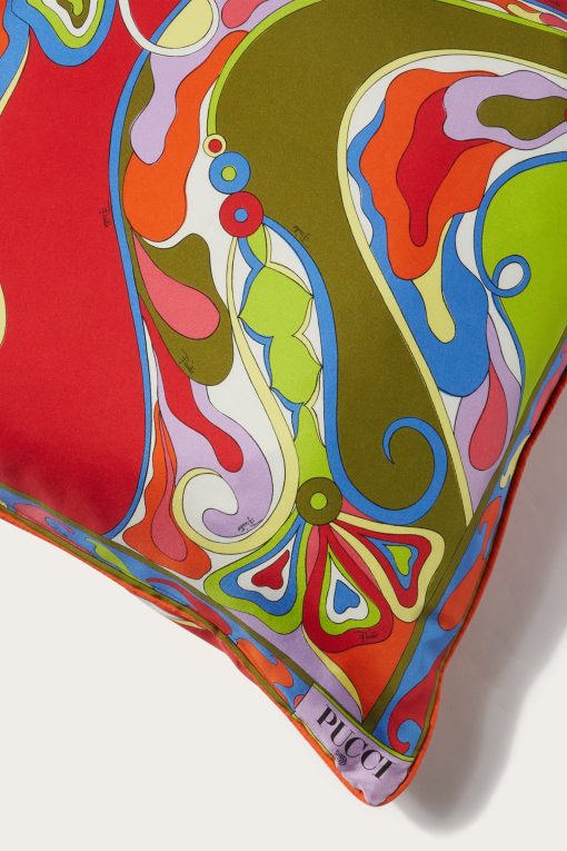 Camille Miceli puts Pucci’s cheerful design direction on full show with silk-twill cushion: it’s covered with the opulent Orchidee and Iride prints in technicolour hues.