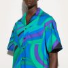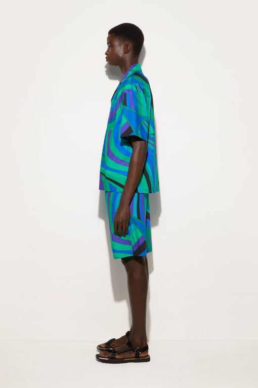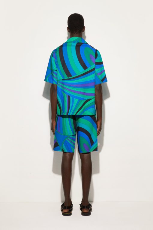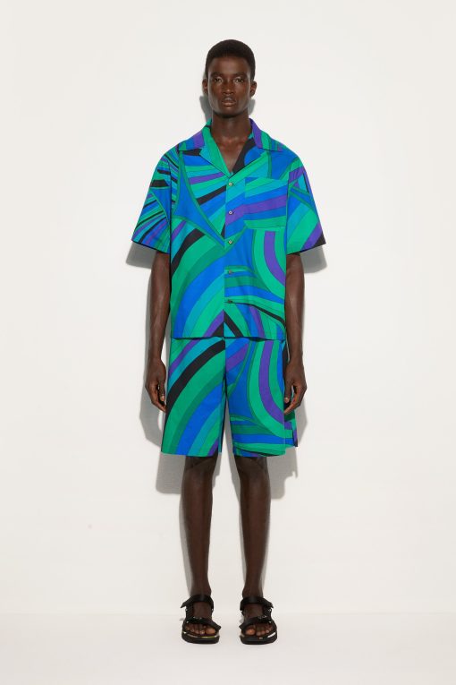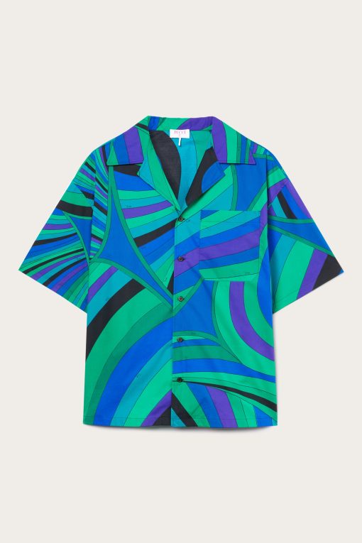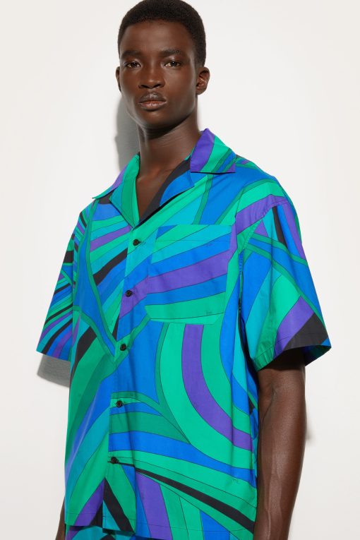 A wardrobe classic reinterpreted with the unmistakable Pucci touch. This loose-fitting bowling shirt combines comfort and style with its straight, relaxed fit. The chest pocket adds a tailored detail, while the lightweight cotton poplin ensures coolness and a soft touch finish. The emerald Iride print lends vibrant energy to the garment, making it perfect for those who like to dress with character and lightness.