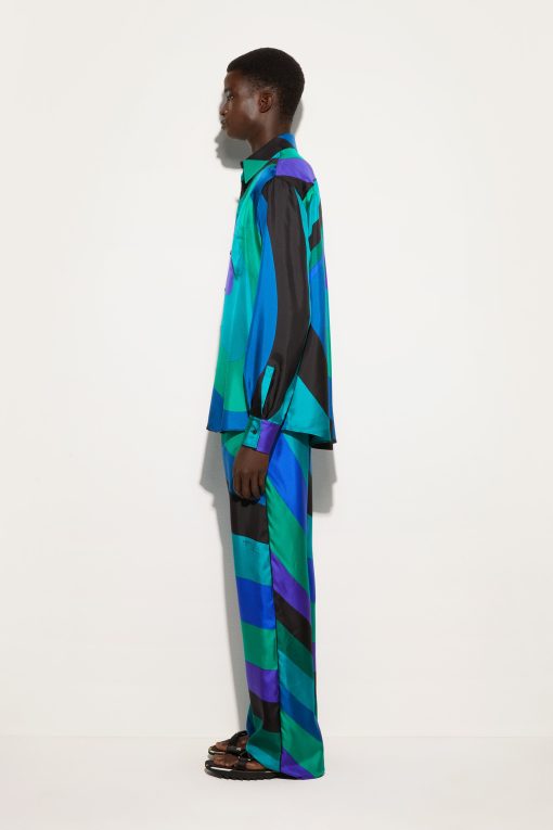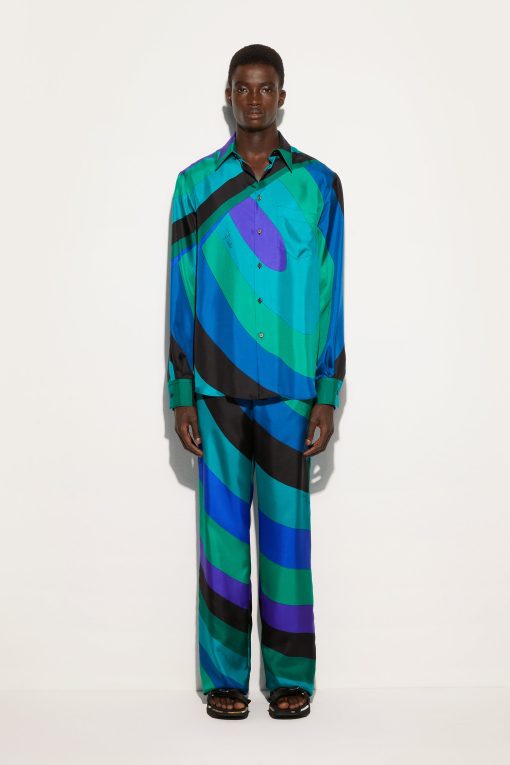 Fluid elegance and uncompromising comfort. These wide-leg, mid-rise pants wrap the silhouette with a soft, lightweight fit, perfect for those who love a sophisticated look without sacrificing practicality.Made of 100% silk, they offer an extremely lightweight feel and movement, while the waistband ensures a harmonious fit. The Iride print in emerald gives depth and dynamism to the design, enhancing the unmistakable Pucci aesthetic.