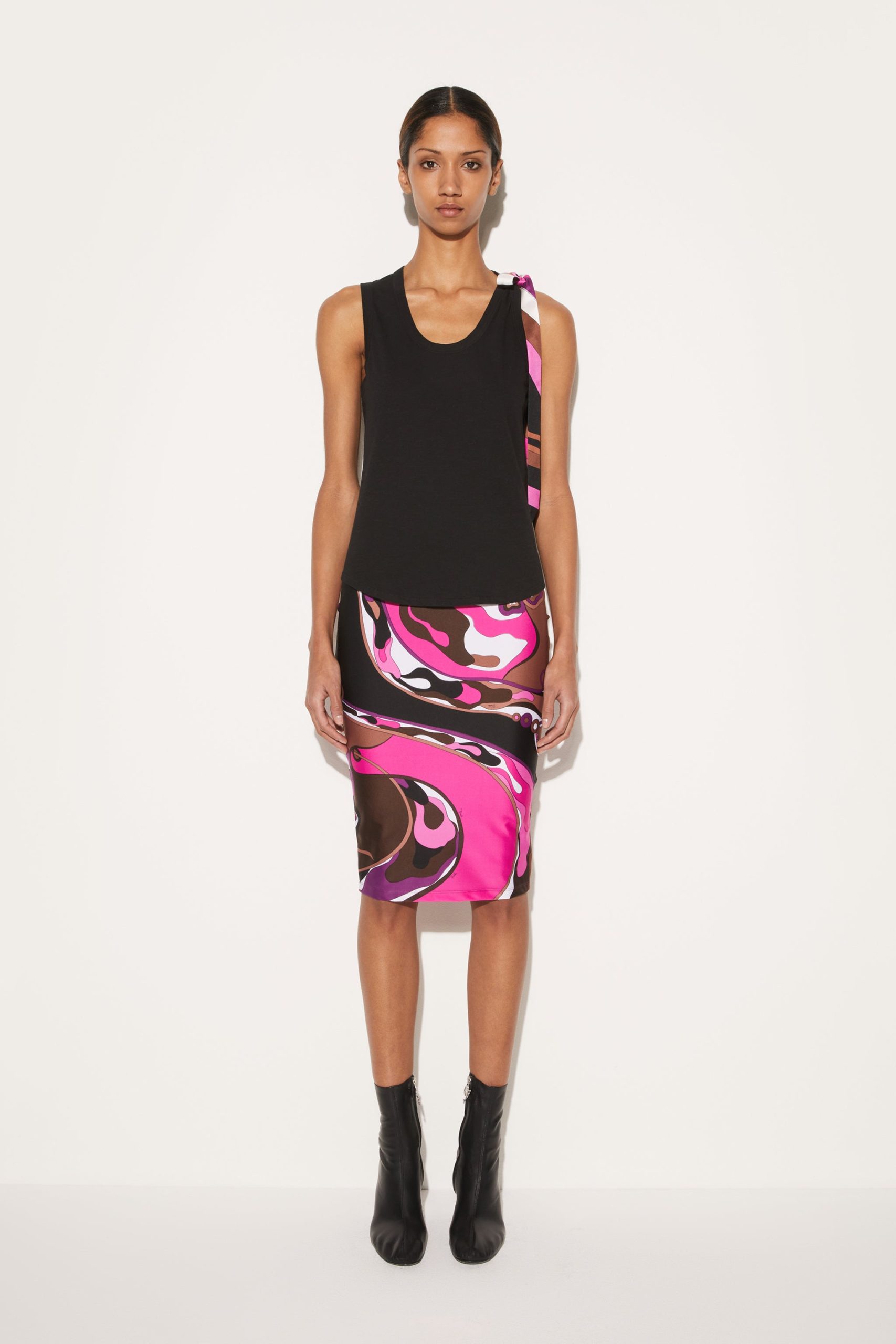 This scoop-neck cotton top has a flair that’s distinctively Pucci. It features a silk-twill tie at one shoulder, which is stamped with the storied Iride print in a vivid purple, fuchsia and brown colourway.