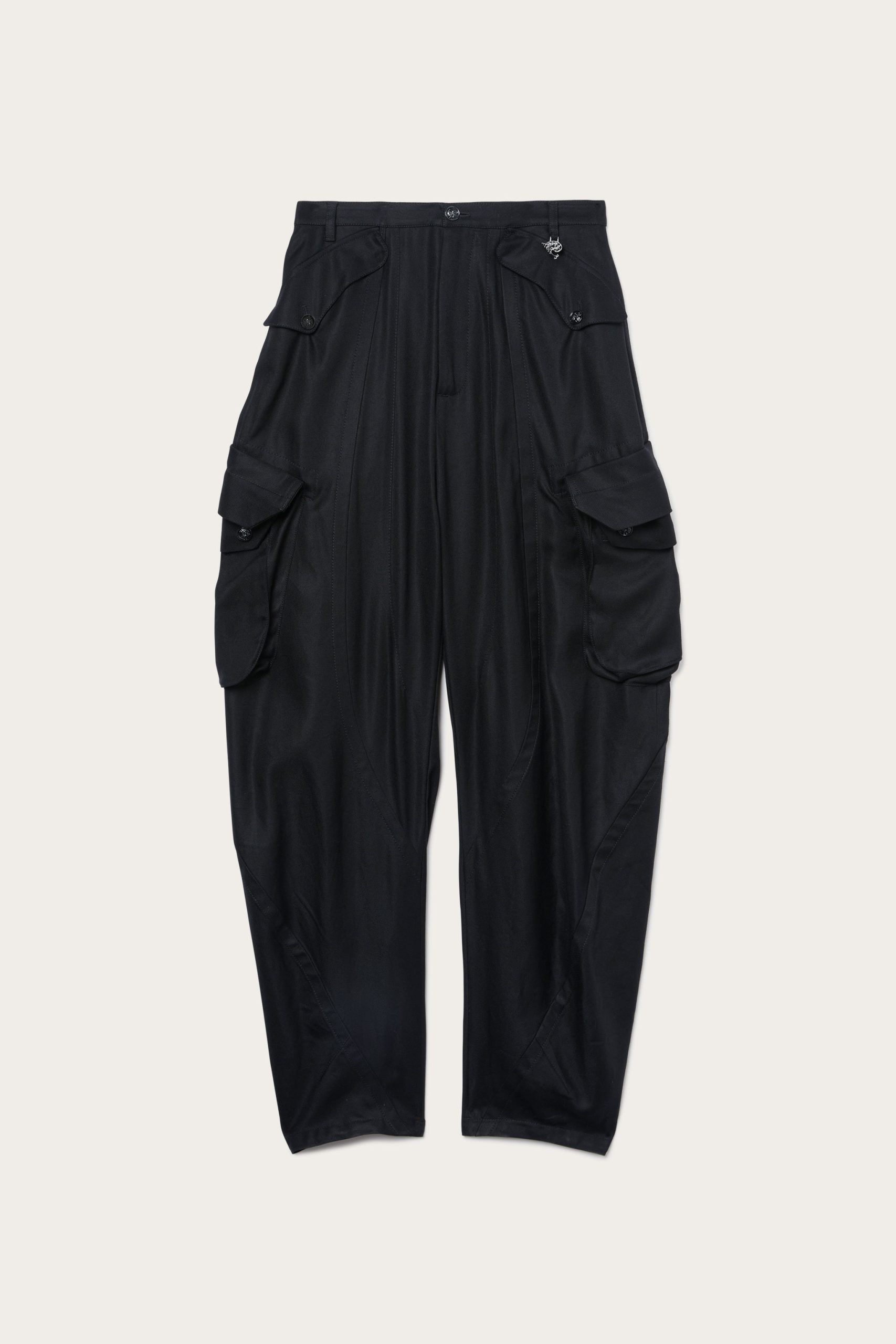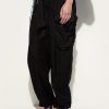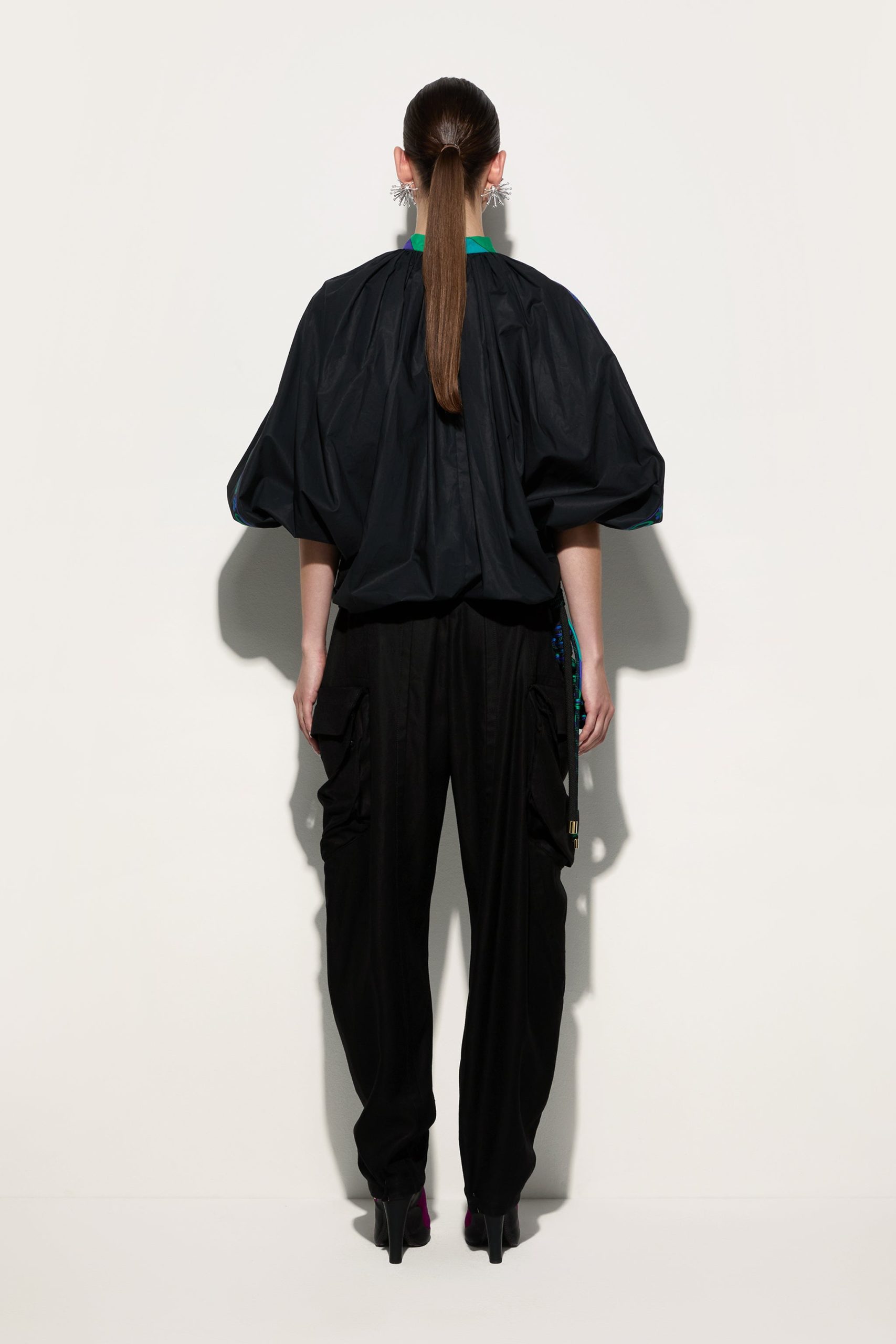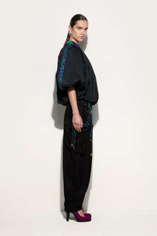 A sophisticated interpretation of utility style. These cargo-designed pants combine functionality and sophistication with their balloon fit, which creates volume and gently cinches at the ankle for a structured yet fluid effect.The four pockets add practicality, making them perfect for those who like a relaxed yet detail-oriented elegance. The black color makes them extremely versatile, ideal for any occasion.