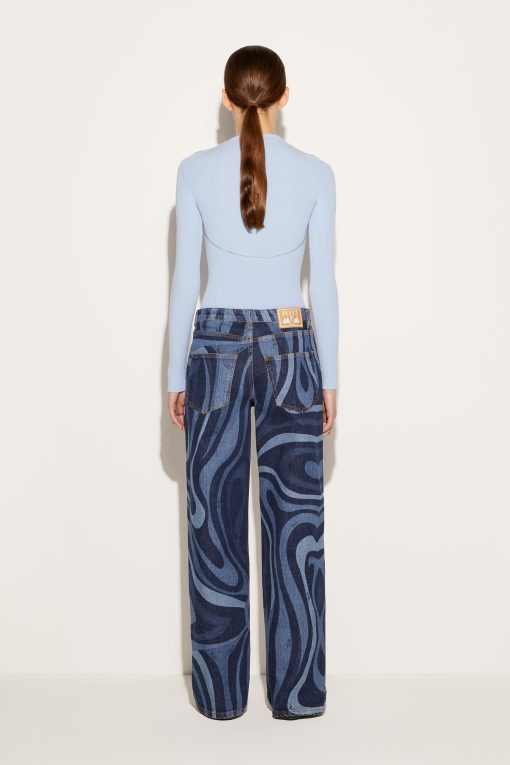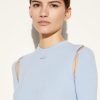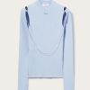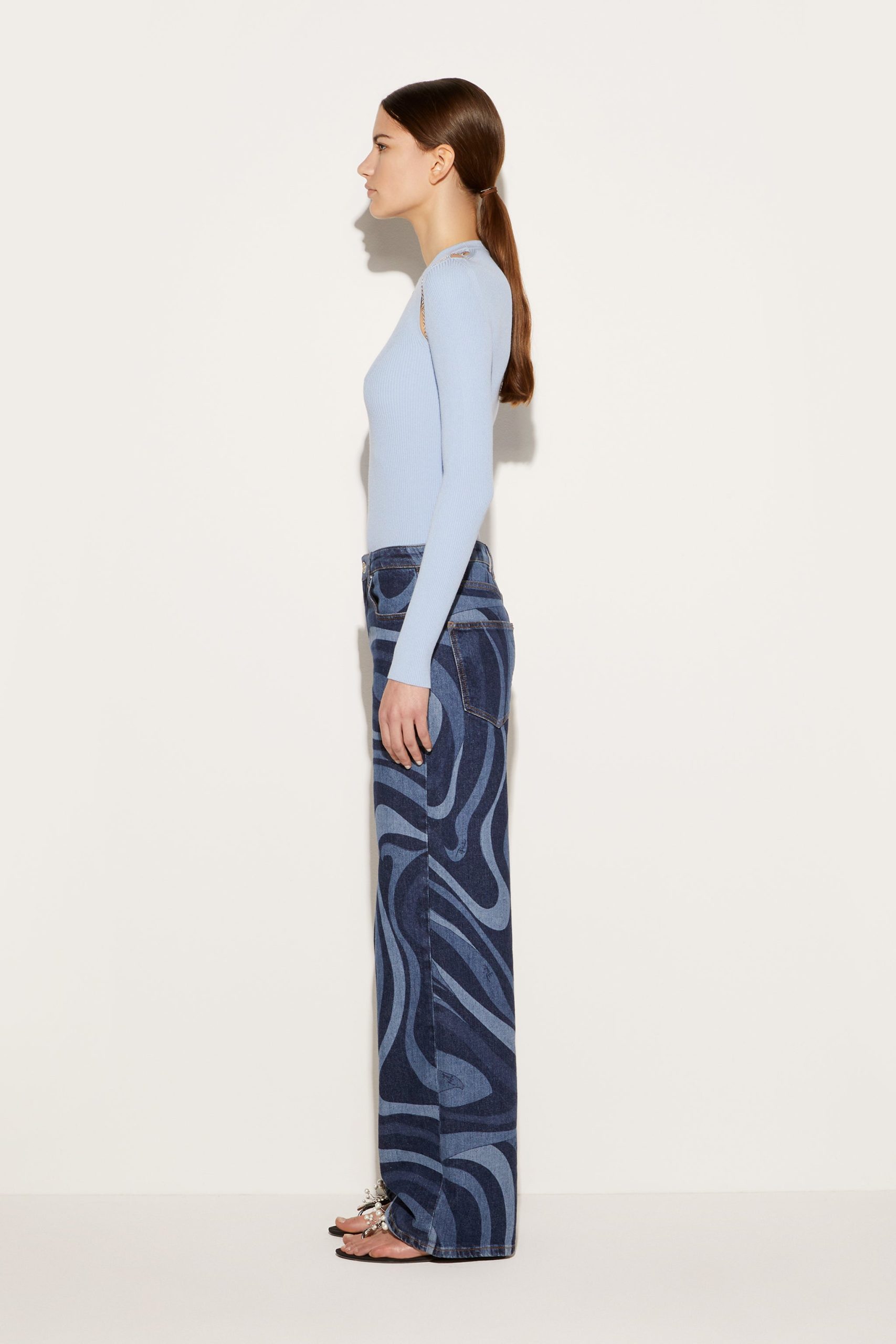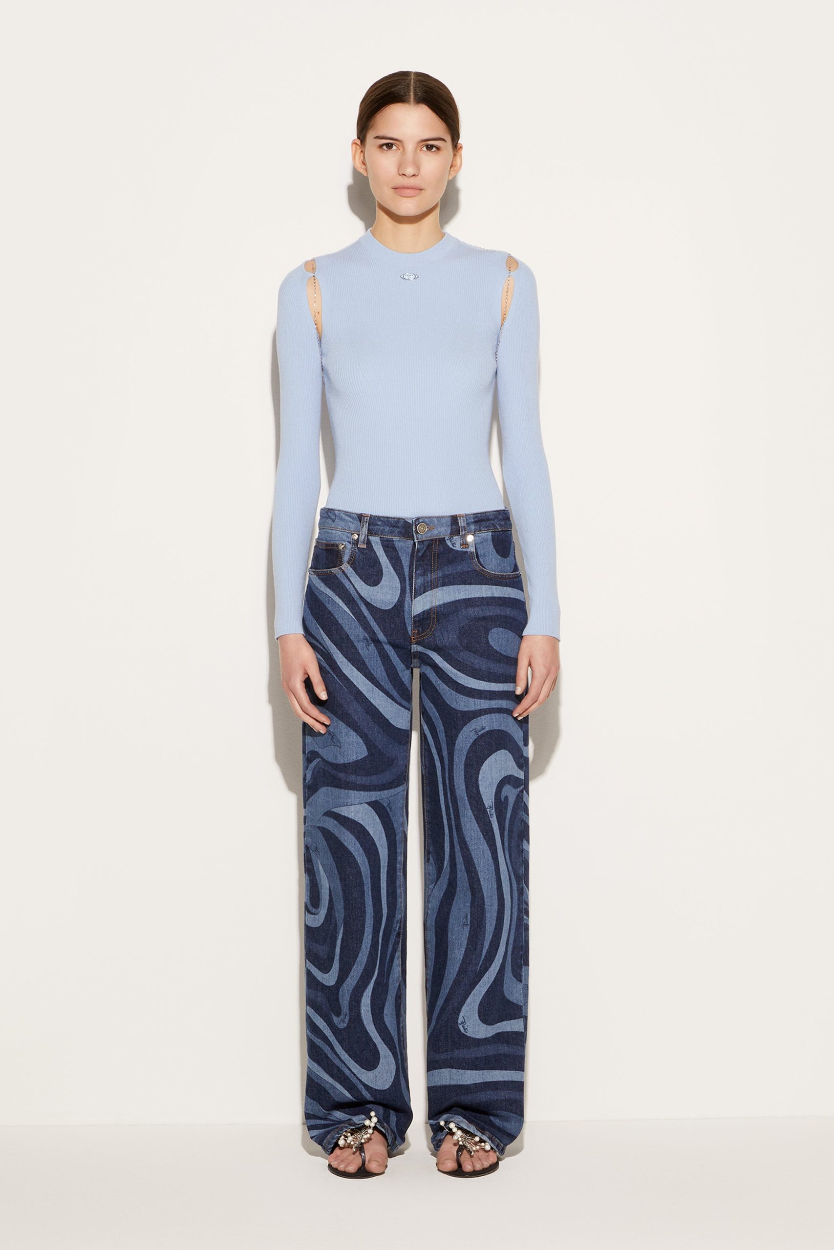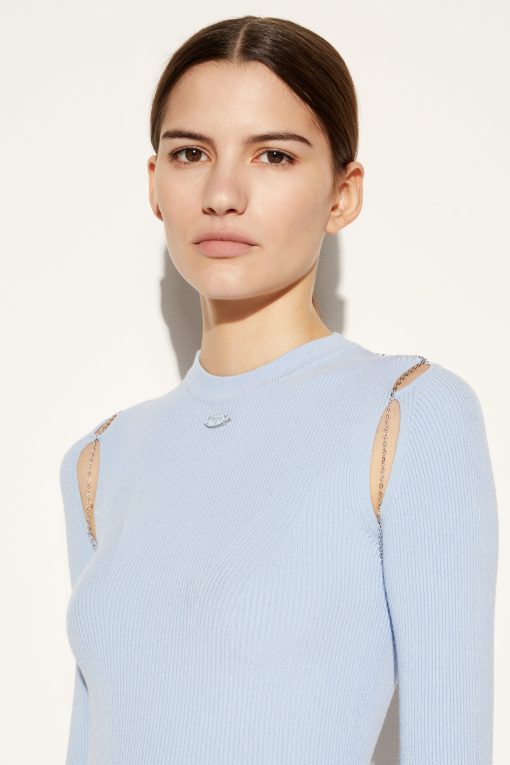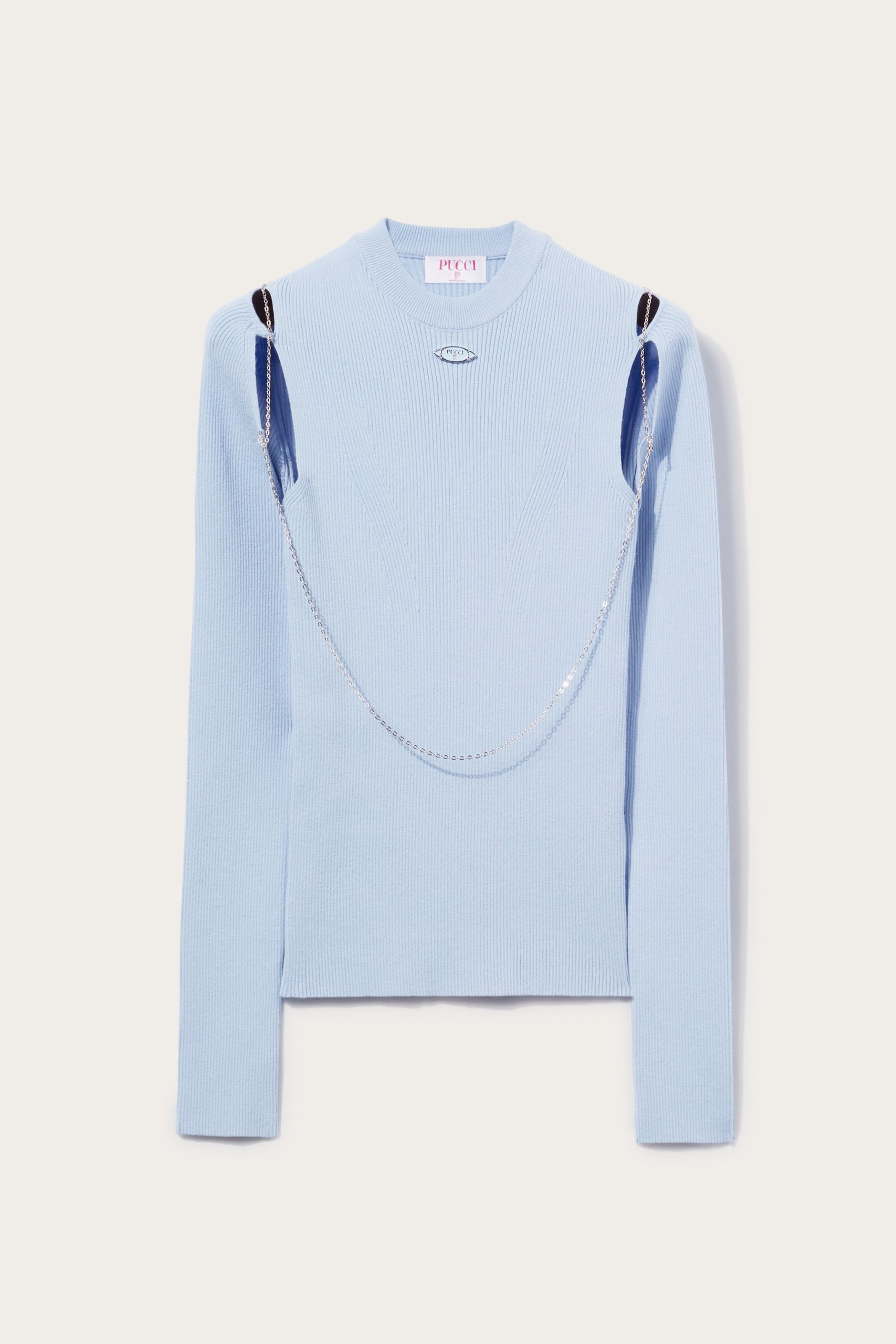 Pucci offers this sweater with an unexpected twist; a slim chain drapes elegantly over the cut-out shoulders and front. It’s complete with an enamelled logo plaque at the neck.