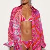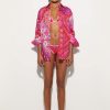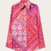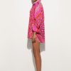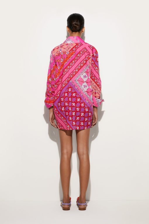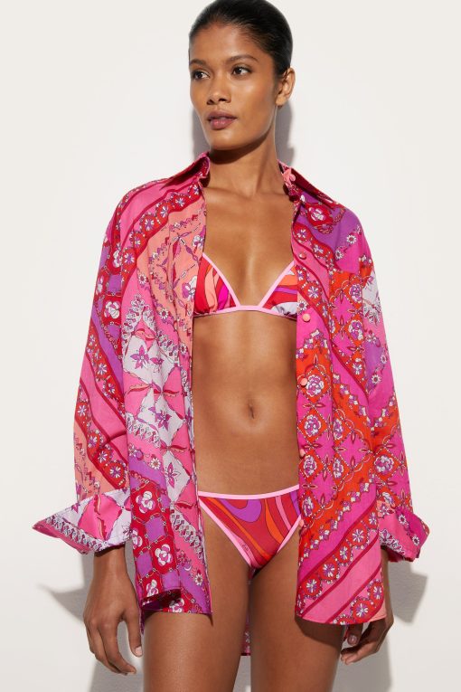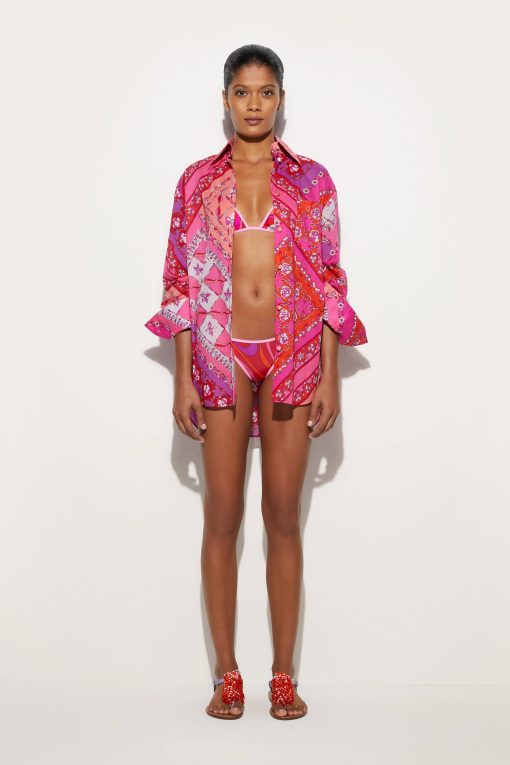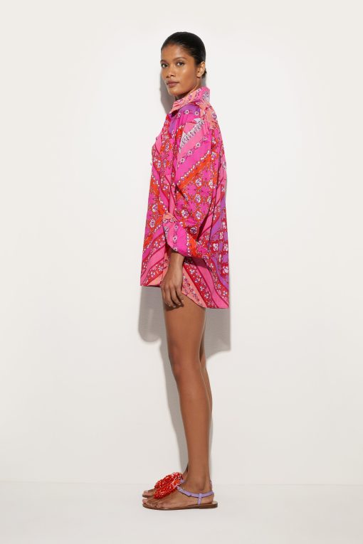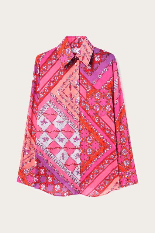 A fresh and sophisticated interpretation of an essential garment. This long-sleeved shirt features a slightly oversized fit that falls naturally, giving a relaxed yet refined allure. The light draped cotton with its soft hand caresses the skin and ensures maximum comfort for any occasion. The classic design, with a collar and button closure, is enhanced by a side pocket, a practical detail that completes the look. The Festa print in shades of coral and fuchsia adds a distinctive touch, turning this shirt into a versatile and timeless garment.