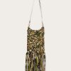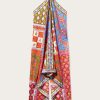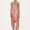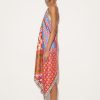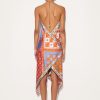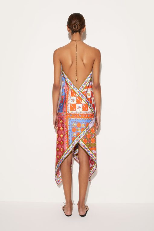 The dress is adorned with a modern iteration of the Festa print, paying homage to Pucci’s iconic pattern play. It’s cut from silk twill to a relaxed silhouette that falls to a handkerchief hem reminiscent of the house’s iconic scarves. Note the interlocking fish charm at the chain-link fastening: a motif introduced by Camille Miceli.