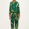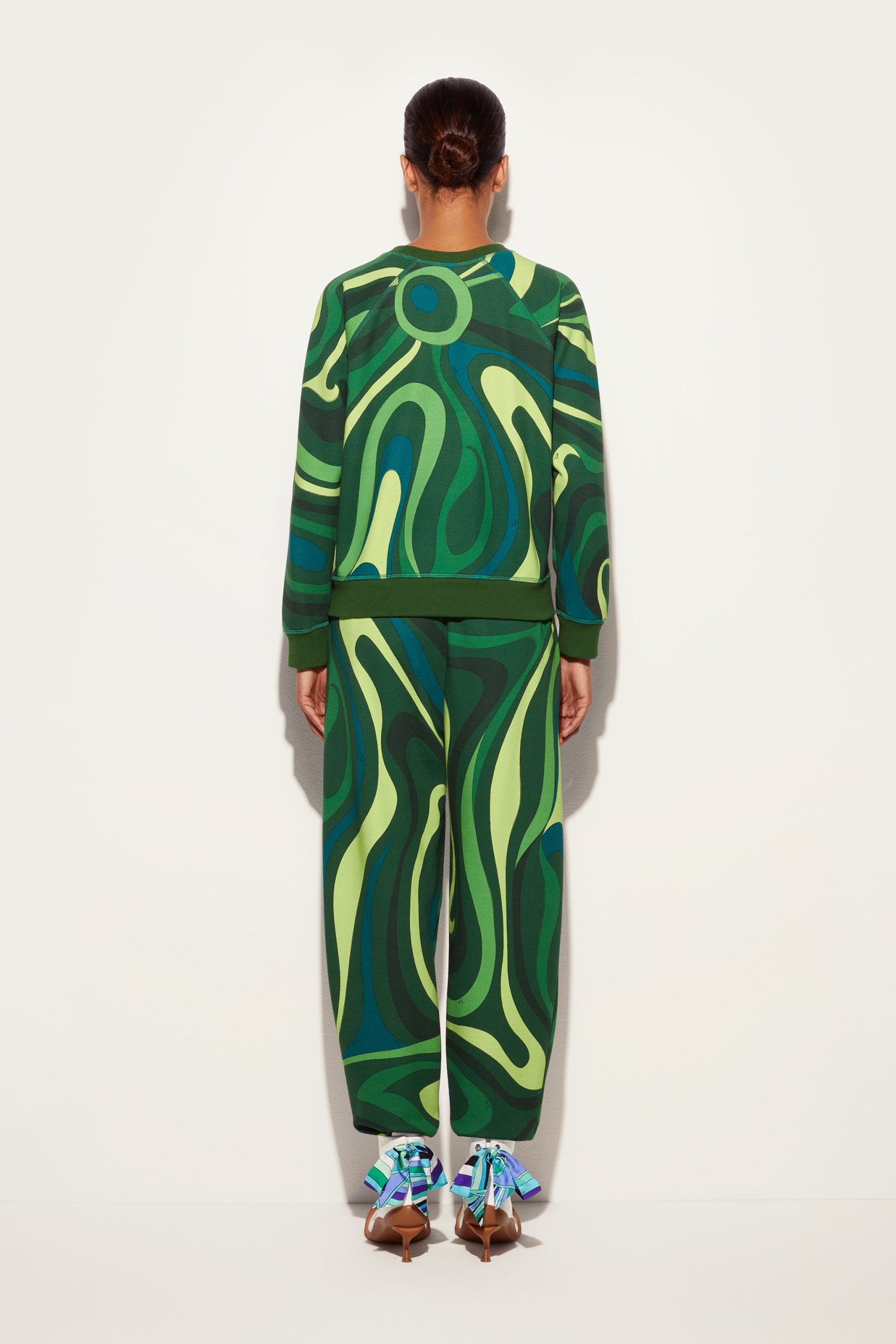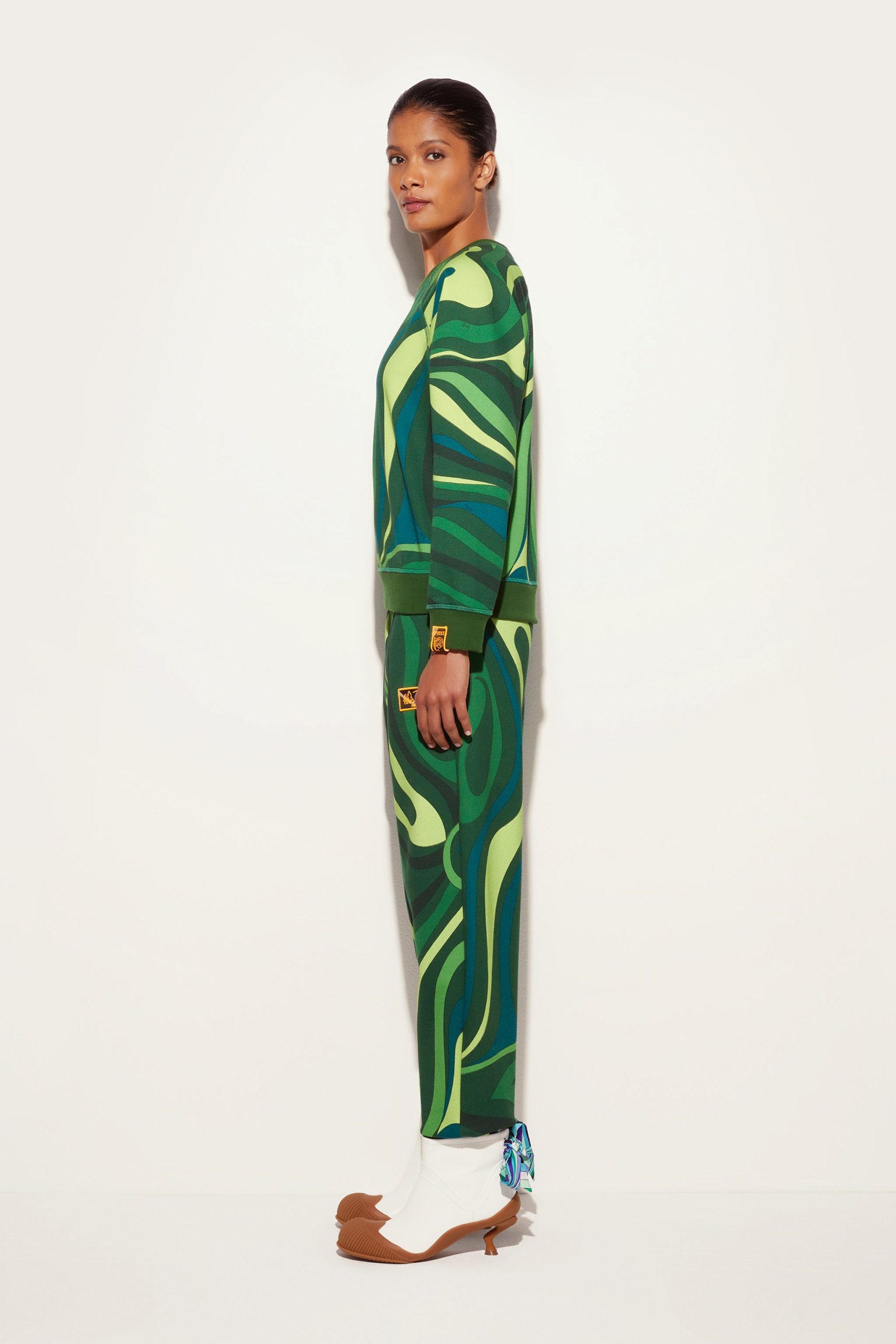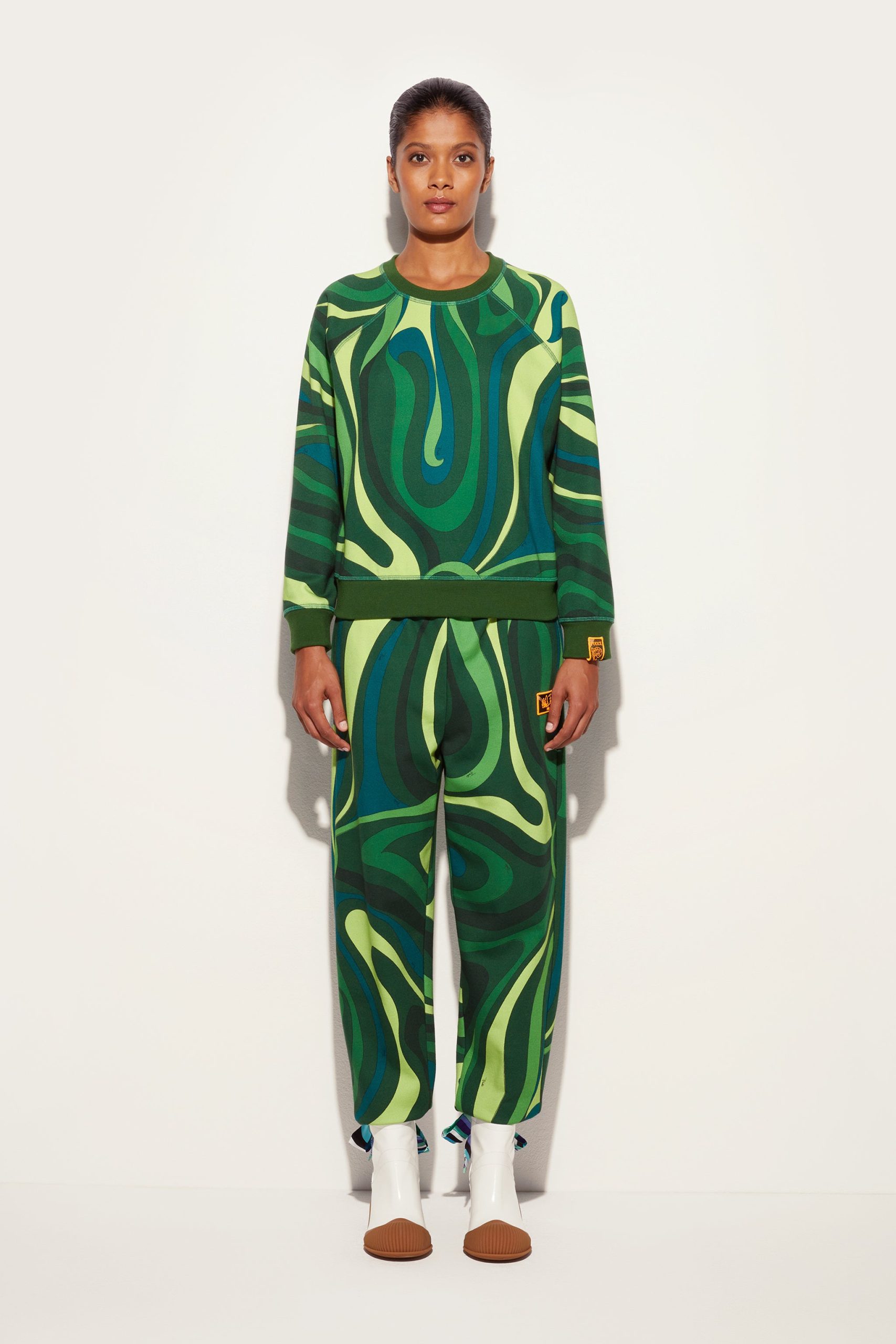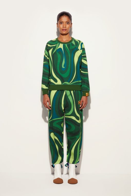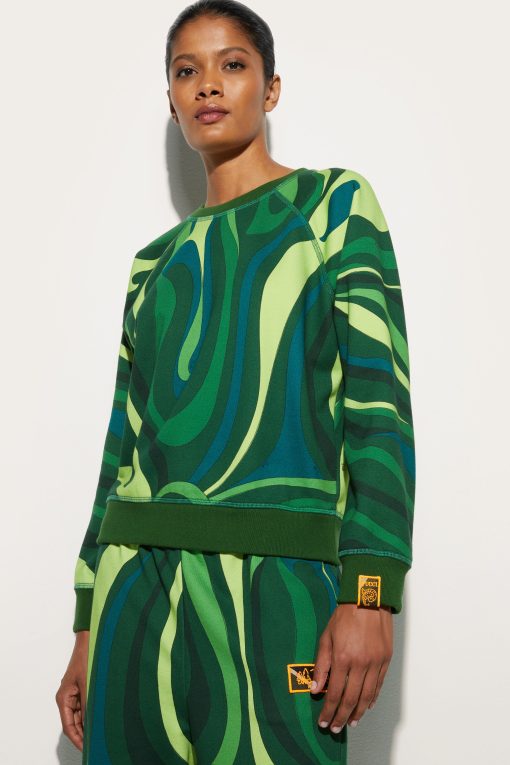 Style and comfort embrace in this warm fleece sweatshirt with Green-colored Marmo print that combines the softness of materials with the dynamism of PUCCI’s iconic graphics. Ribbed trims on the waist, cuffs and neckline create a fitted silhouette, perfect for a casual yet refined look, in the city as well as in moments of relaxation. It is easily paired with tailored-cut pants, denim or its matching pants, for a style that ranges between elegance and versatility capturing the metropolitan spirit with a hint of contemporary sophistication.