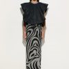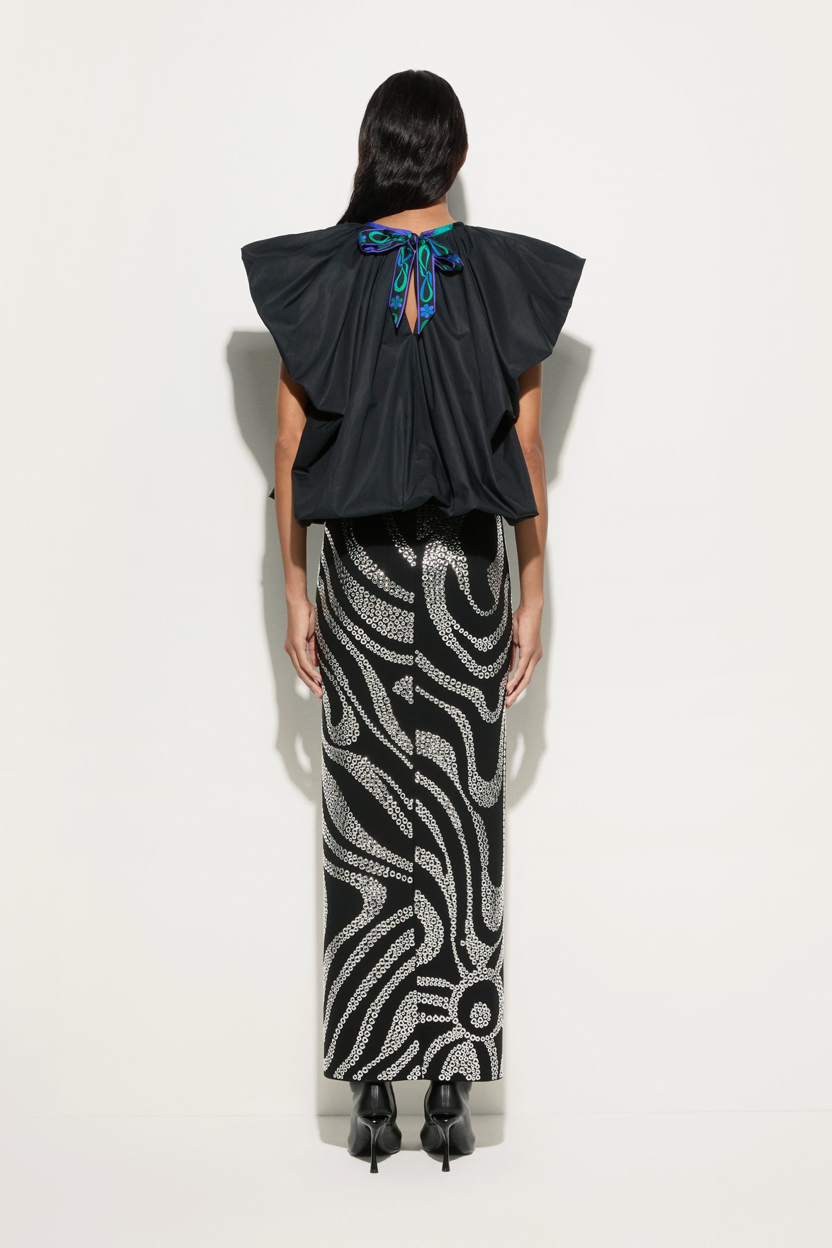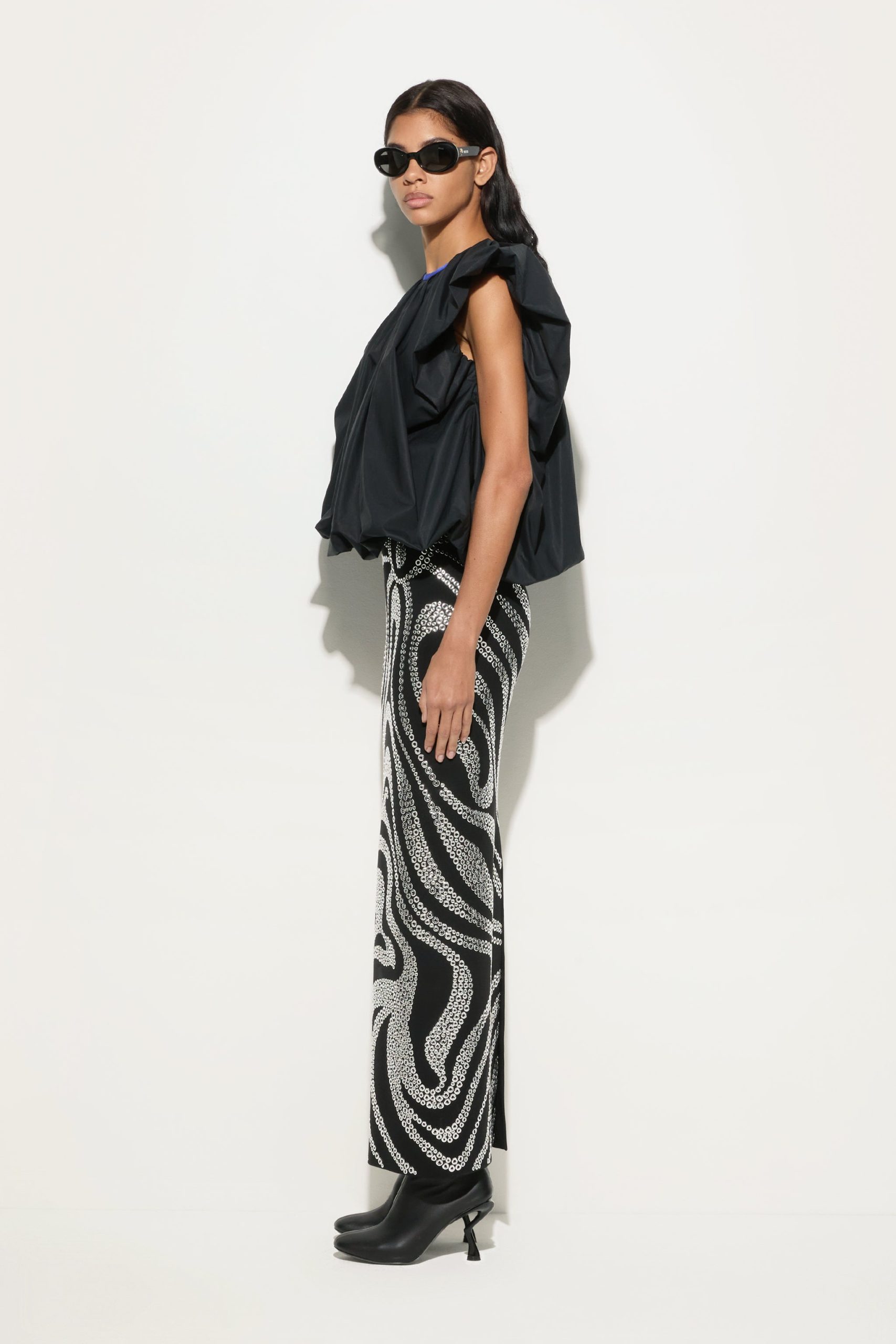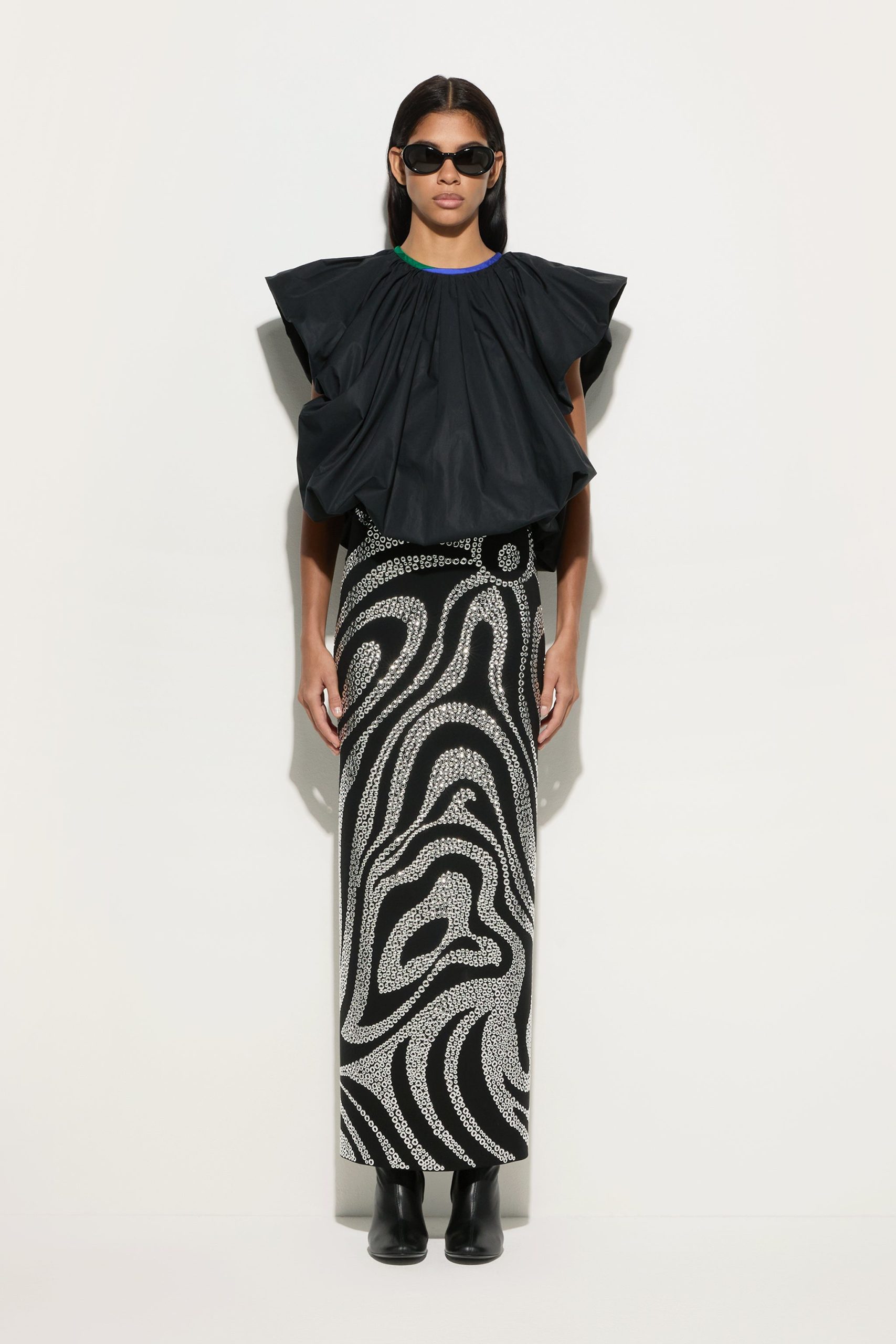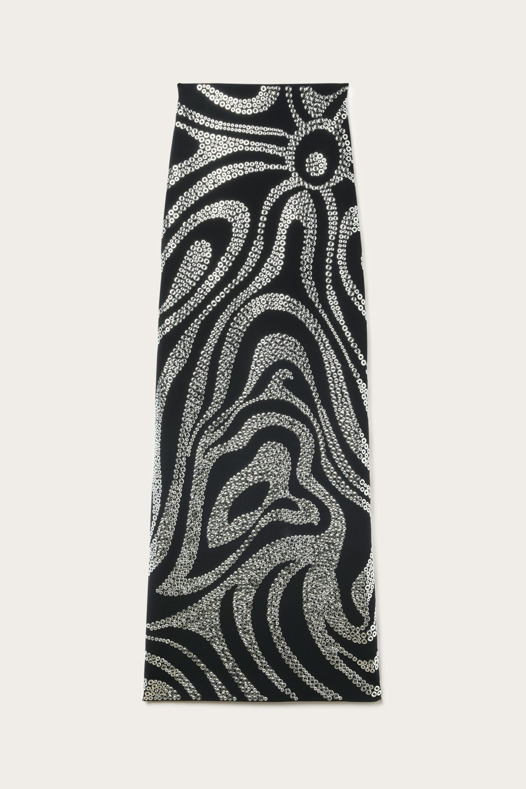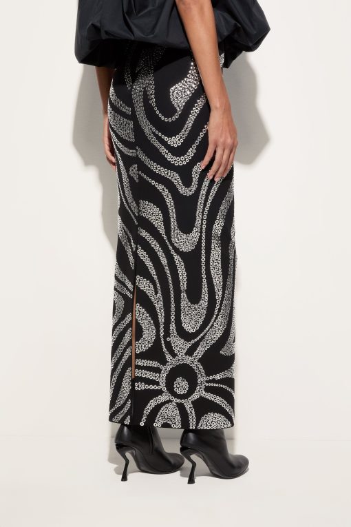 A wrap-around silhouette and a design that shines its own light. This calf-length skirt flatters the figure with its fitted fit and high waist, enhancing the shape with elegance. The distinctive detail is the silver metal round stud embroidery, which creates a bright and sophisticated effect. Made of super-stretchy compact viscose knit, it offers a slight compression effect for a flawless fit, shaping the silhouette without sacrificing comfort.
