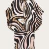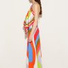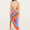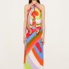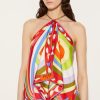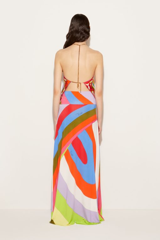 This silk-twill top features a draped silhouette reminiscent of Pucci’s iconic scarves. It’s adorned with clashing Iride and Pesci prints in vibrant hues, and detailed with polished chains at the neck and back – note the intertwined fish charms, a symbol introduced by Camille Miceli.