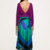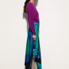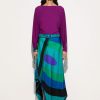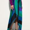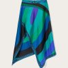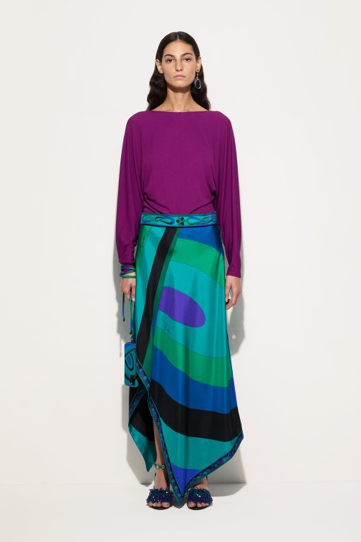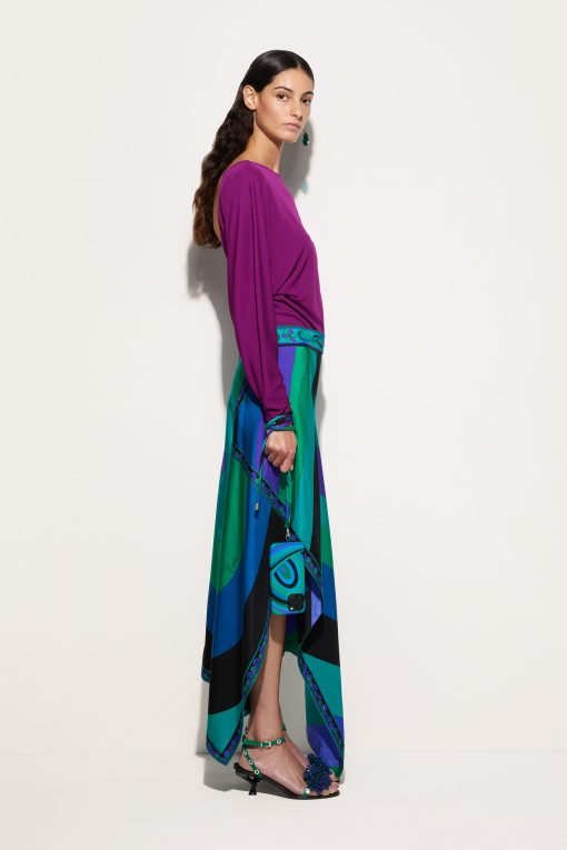 This asymmetrical skirt, with its sinuous hemline from knee to ankle, embodies elegance and movement, designed to enhance the silhouette with a sophisticated and dynamic touch. Generous draping creates a fluid and refined effect, while the defined band adds structure to the design.The Iride print in emerald, with its iconic and bold design, lends distinctive character to a garment that lends itself to any special occasion.