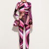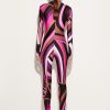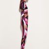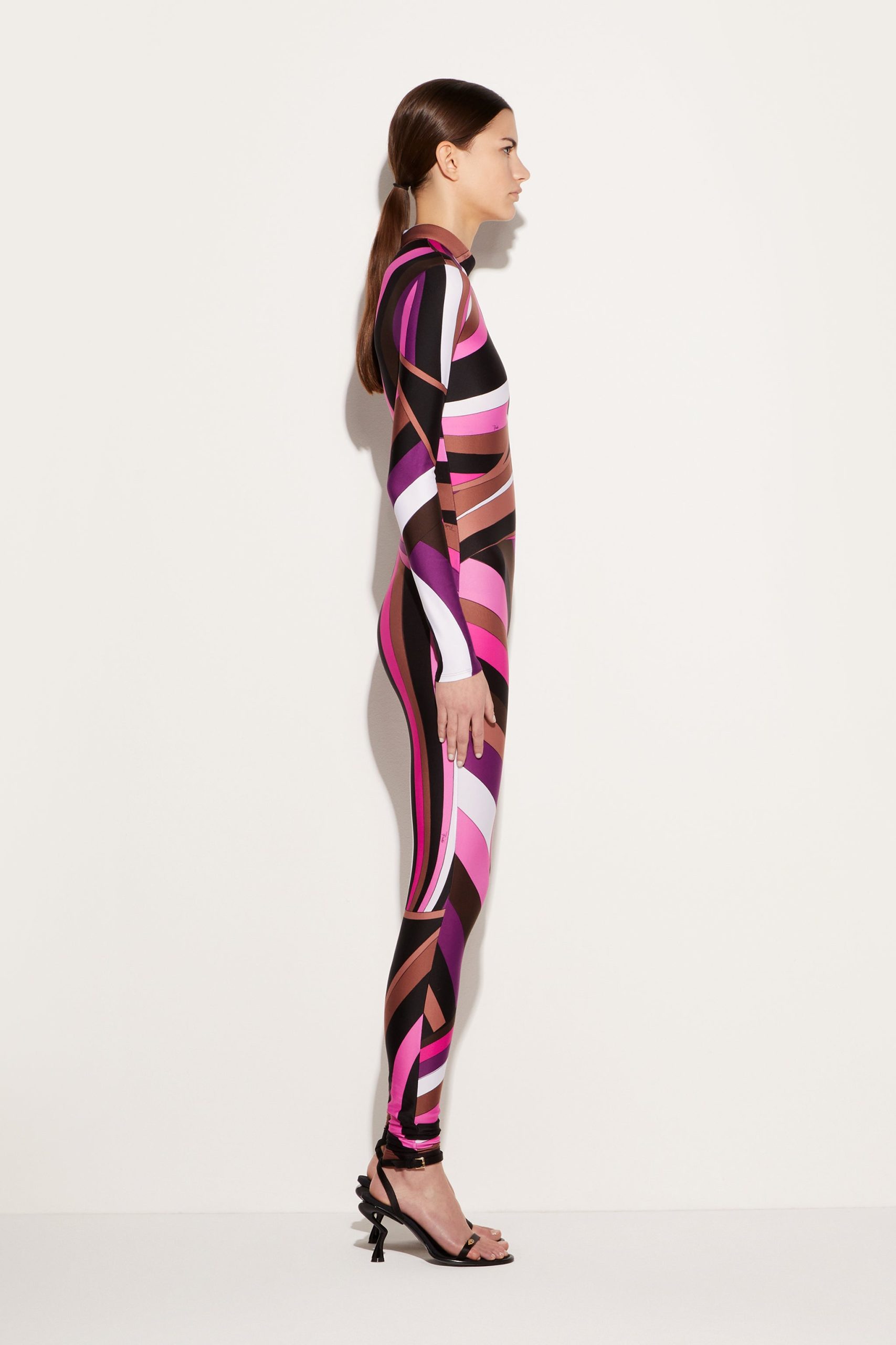 Camille Miceli takes Pucci’s maximalism to new heights with this catsuit. It’s cut from stretch Lycra to a bodycon silhouette and drenched in the Iride print’s rays in pink and purple hues.