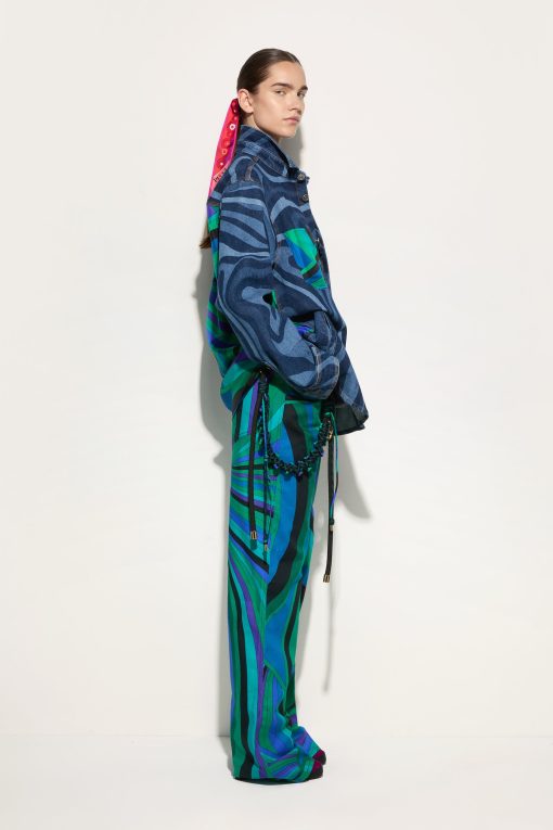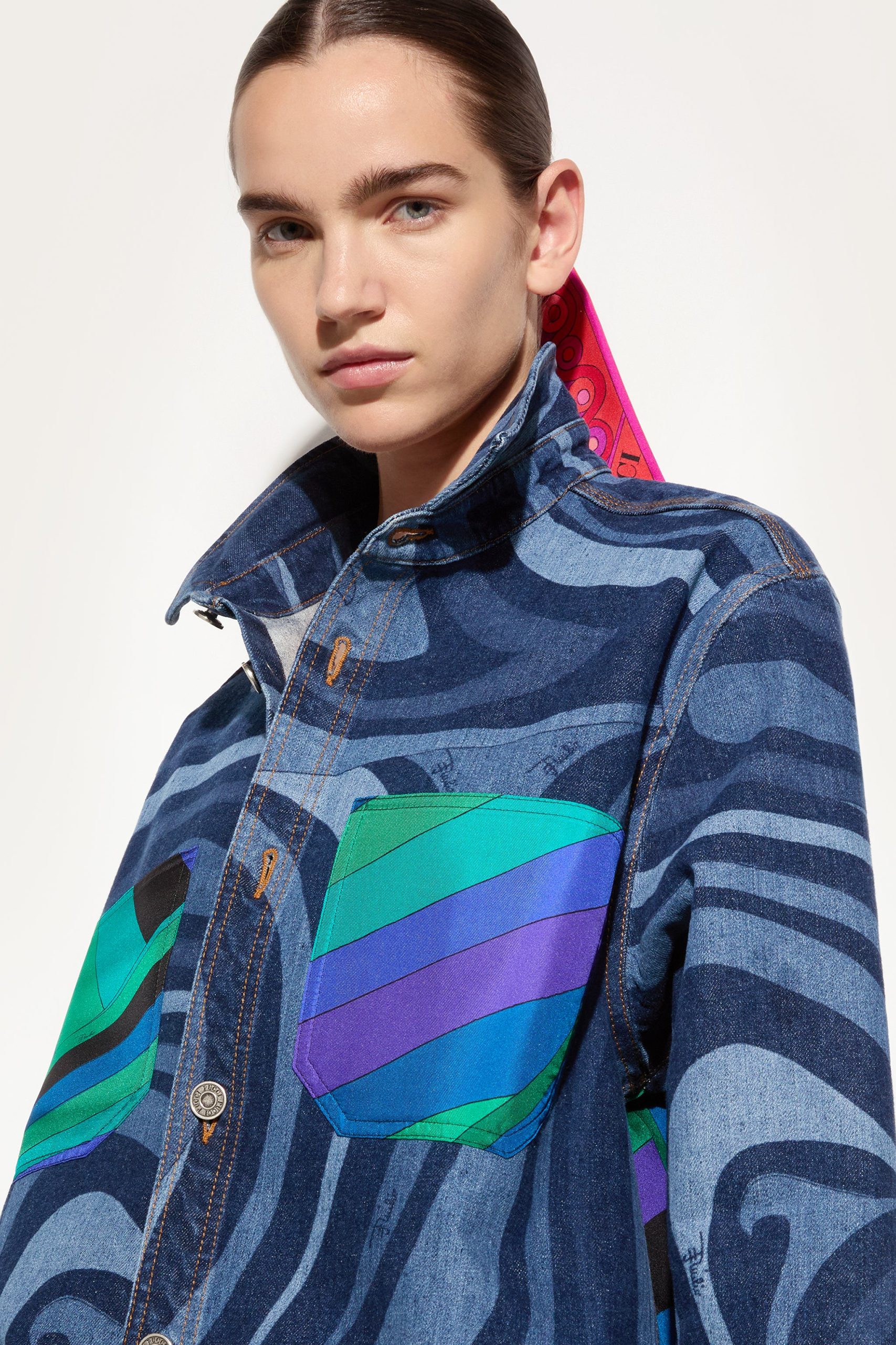 A garment that combines the timeless appeal of denim with the vibrant energy of the iconic Iride print. This straight-cut jacket is the perfect balance of casual and sophisticated, ideal for those who like to stand out with unique details. With its classic collar, buttons along the opening, and practical chest pockets, it easily adapts to everyday or bolder looks.The real surprise? The printed silk back that gives a touch of originality and luxury. Wear it with a pair of jeans for a total denim look.