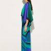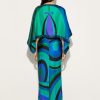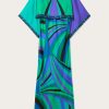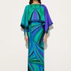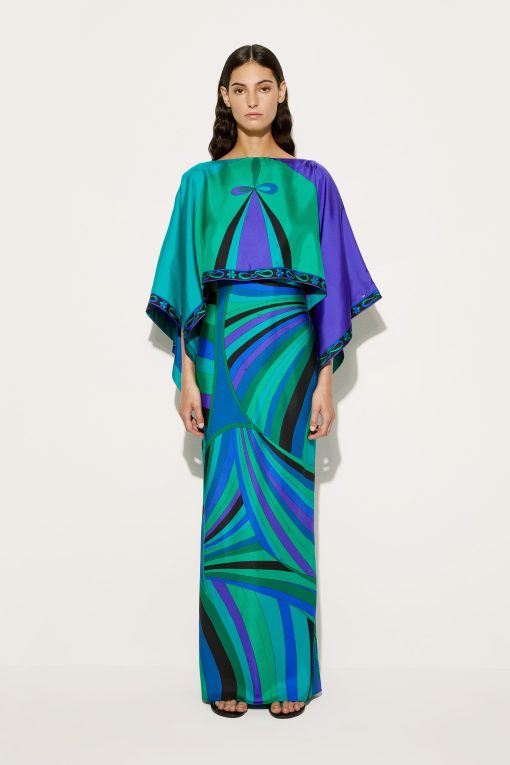 A garment of dramatic elegance, combining fluidity and structure in perfect balance. This silk twill long dress lightly envelops the figure, while the overlapping cape at the shoulders creates a sophisticated and theatrical movement. The flowing, angled sleeves add dynamism, enhancing the silhouette with a refined harmony of volumes. The Iride print in emerald gives a vibrant and refined touch, making this dress a true celebration of Pucci style.