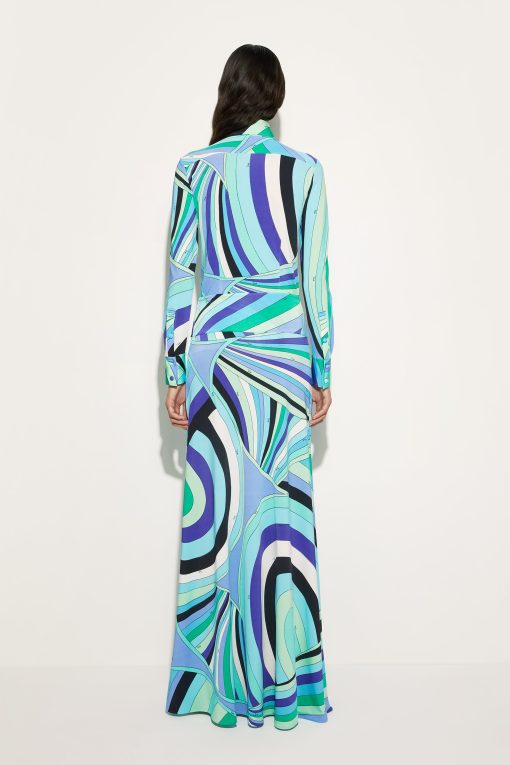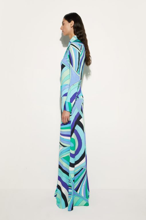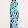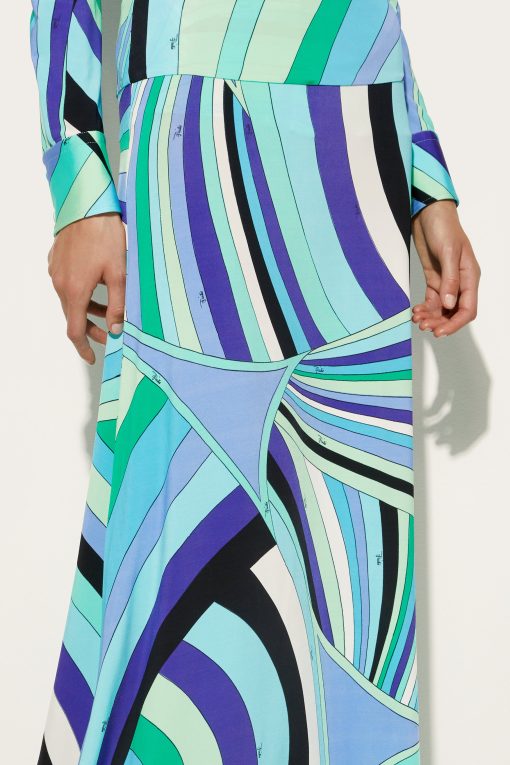 Essential elegance and fluid movement meet in this long skirt, featuring a straight cut that slims the silhouette. The ribbed waist adds definition to the shape while offering comfort and support. Made of jersey with lycra yarns, this skirt is a reinterpretation of Pucci’s iconic fabric, designed to enhance the shine and softness of the garment. The Iride print in shades of green and lilac gives a refined and dynamic touch, making it perfect for those who love the brand’s distinctive style.